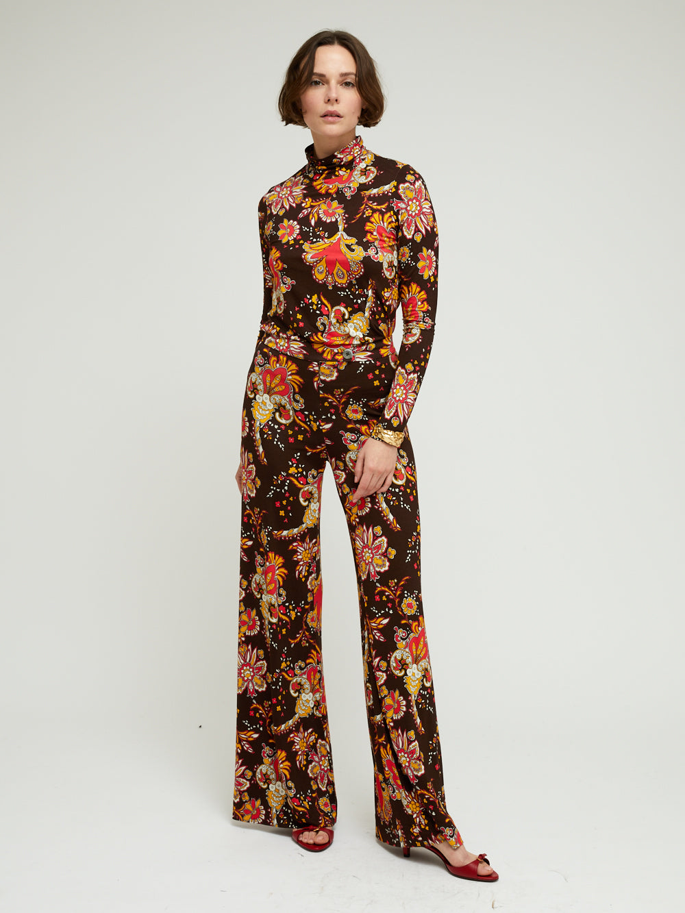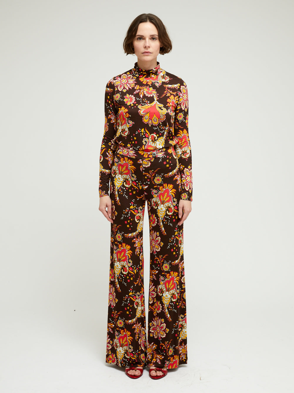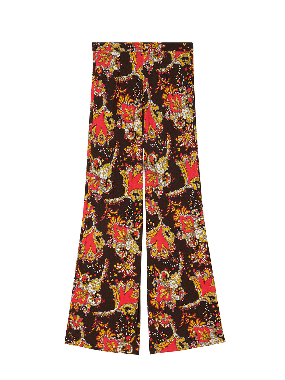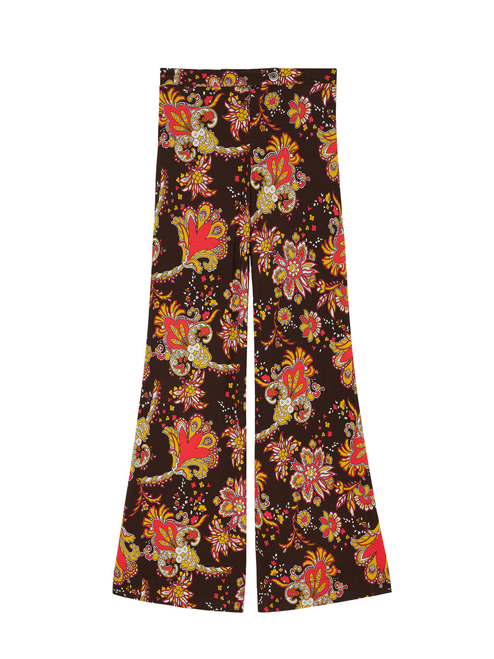 Giudecca Pondichery pants by La Prestic Ouiston made from printed viscose. A Palazzo cut, close to the body at the waist.