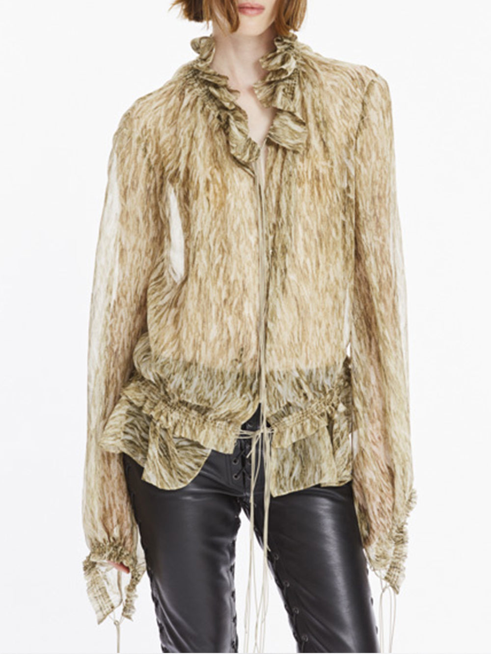 The printed Lei blown by designer Petar Petrov is a semi-shrewy voile top in the tones of green and beige with furrowed detailing and ties to be made at the neckline and on the cuffs. Its flounced collar and cuffs, loose long sleeves and waist-length gudges give it structure and a vintage, loose side.