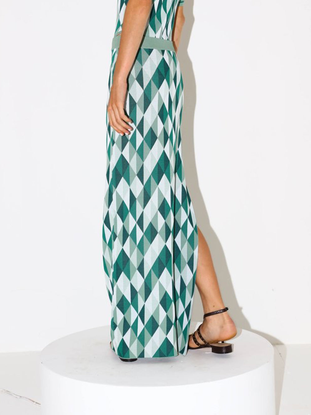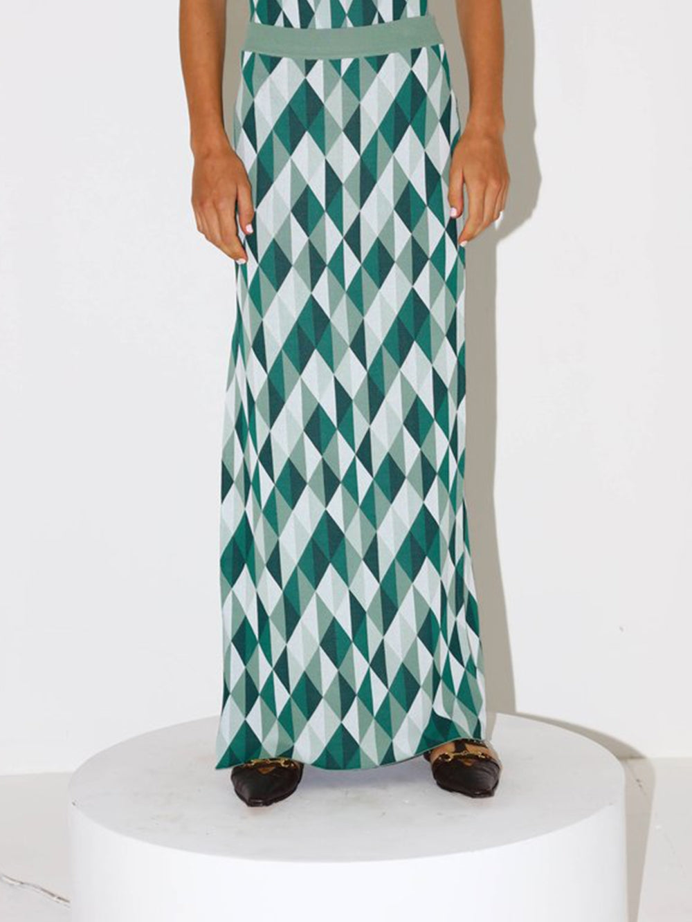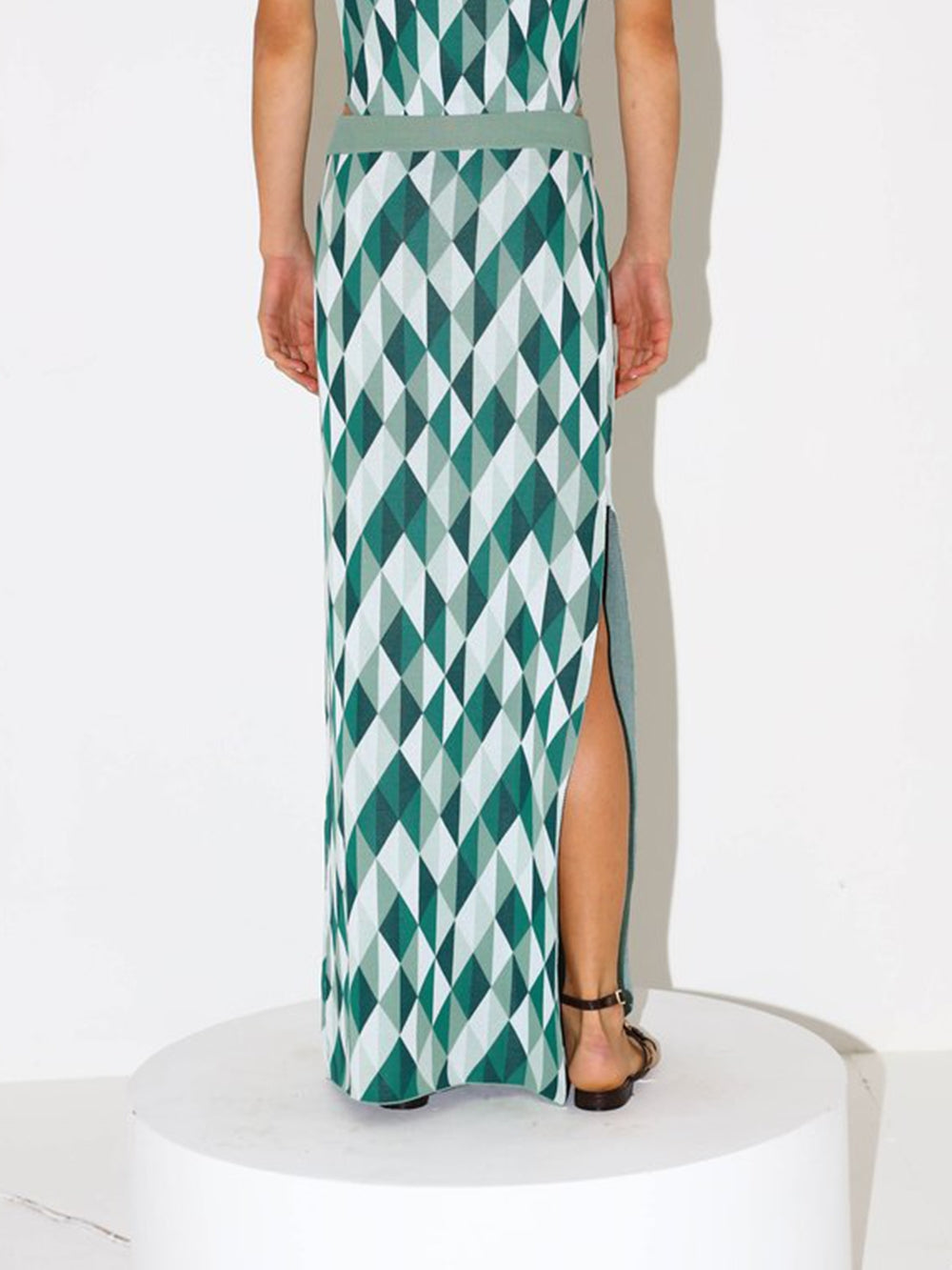 Dodo Bar Or Pam Skirt. This long, three-coloured skirt made from a geometric jacquard knit has a ribbed elasticated waist, a straight cut and is worn high-waisted. A side slit enhances the piece.