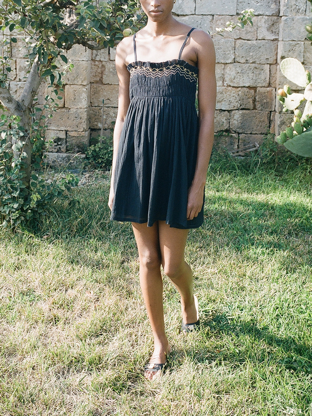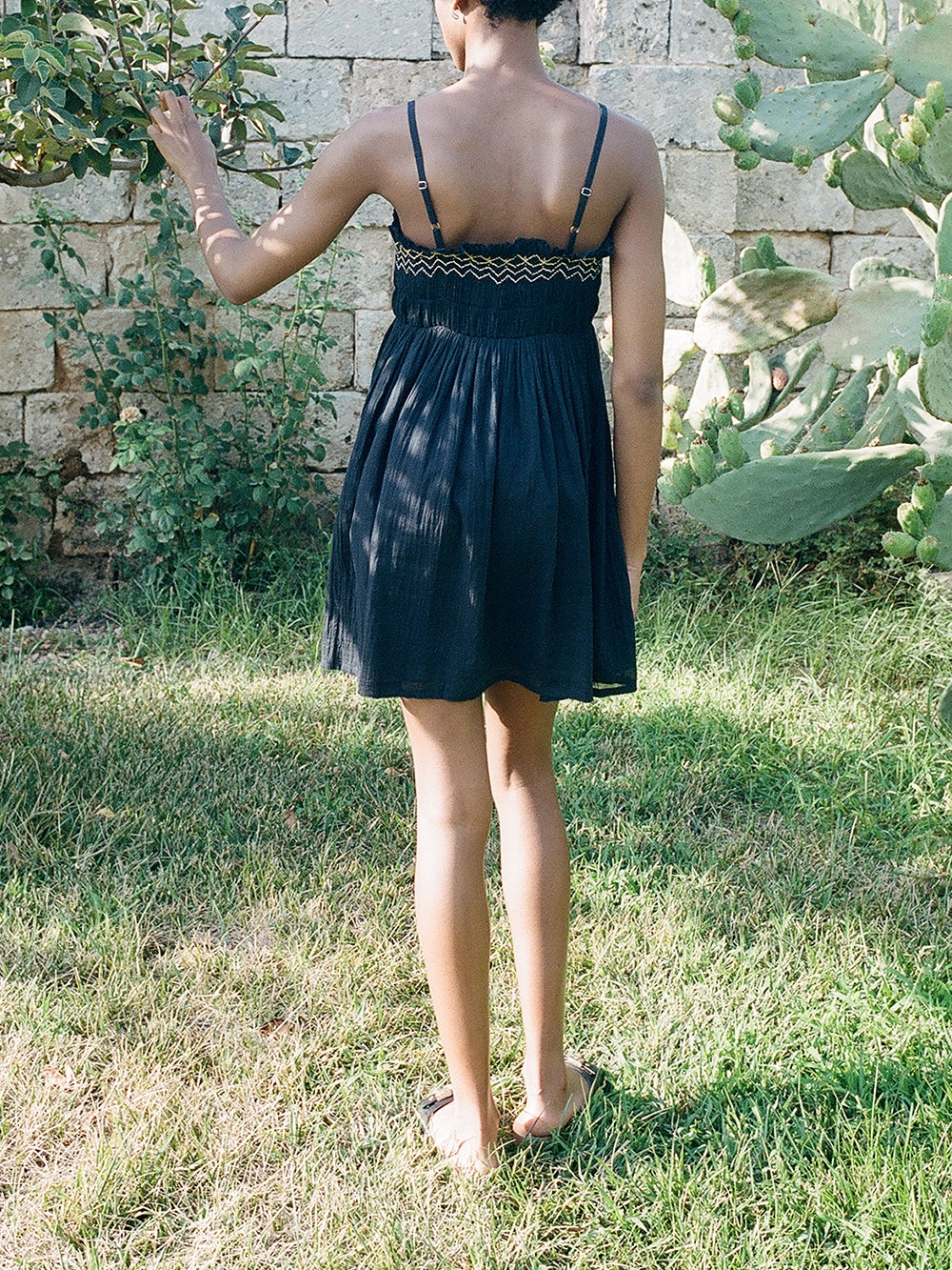 Anaak Rose Smocked Mini Dress. This short cotton voile dress with adjustable straps has a wide neckline, an elastic smocked bust and is fully lined. The piece is hand embroidered by artisans in India using traditional techniques.