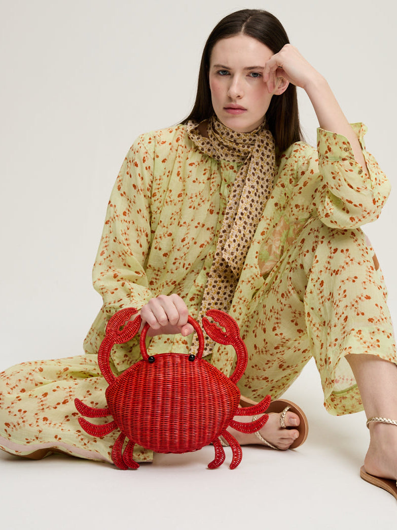 The Serpui Crab Bag is crafted from red wicker in the shape of a crab. This unique bag opens from the top like a clutch and is decorated with two black beads for eyes.