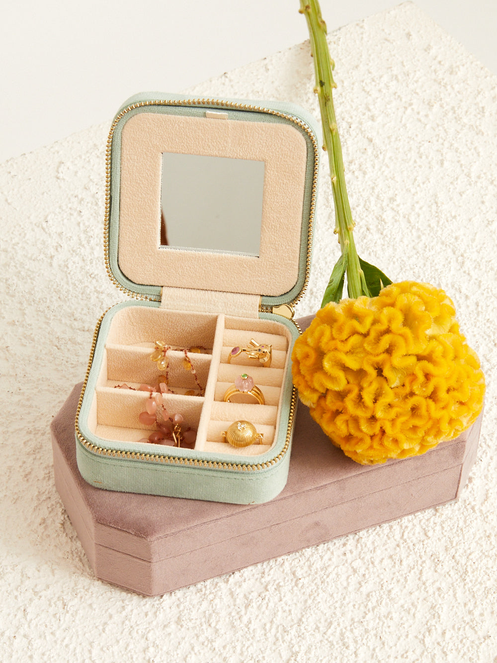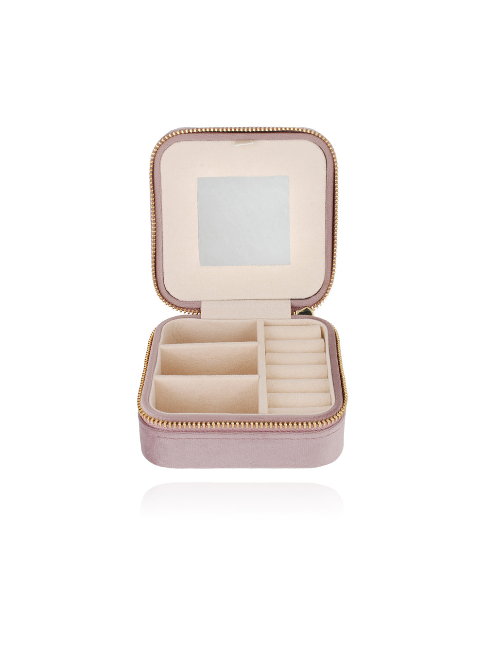 Our By Marie velvet jewelry box is handmade with a flannel interior embellished with a golden zipper. To Inside you will find several compartments allow you to hold several types of jewelry: necklaces, rings, earrings, bracelets. The interior also features a small mirror.