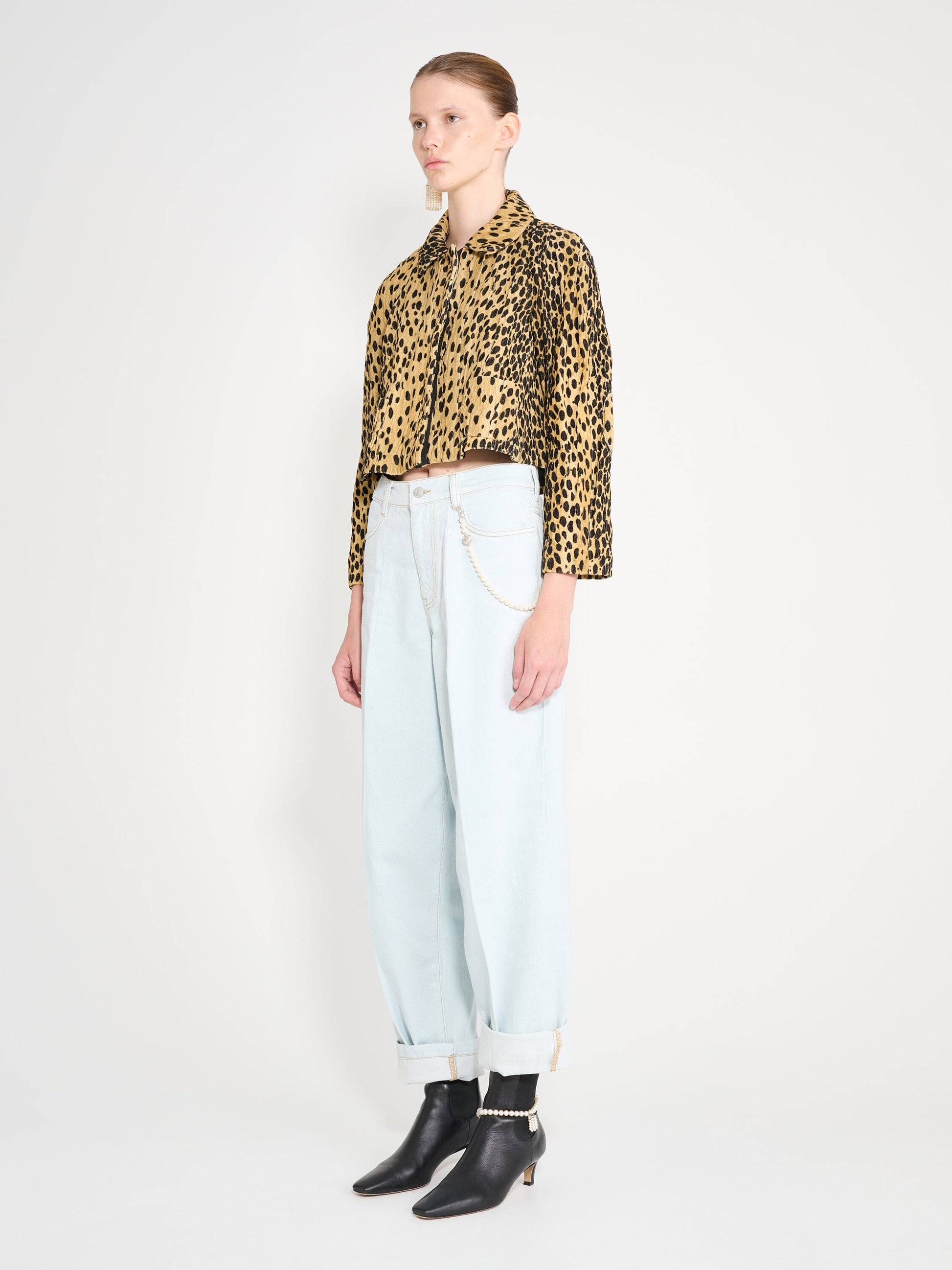 Veste Pixie Léopard signée Nackiyé confectionnée dans un tissu velours à l'imprimé léopard. Une veste courte et à la coupe évasée.
