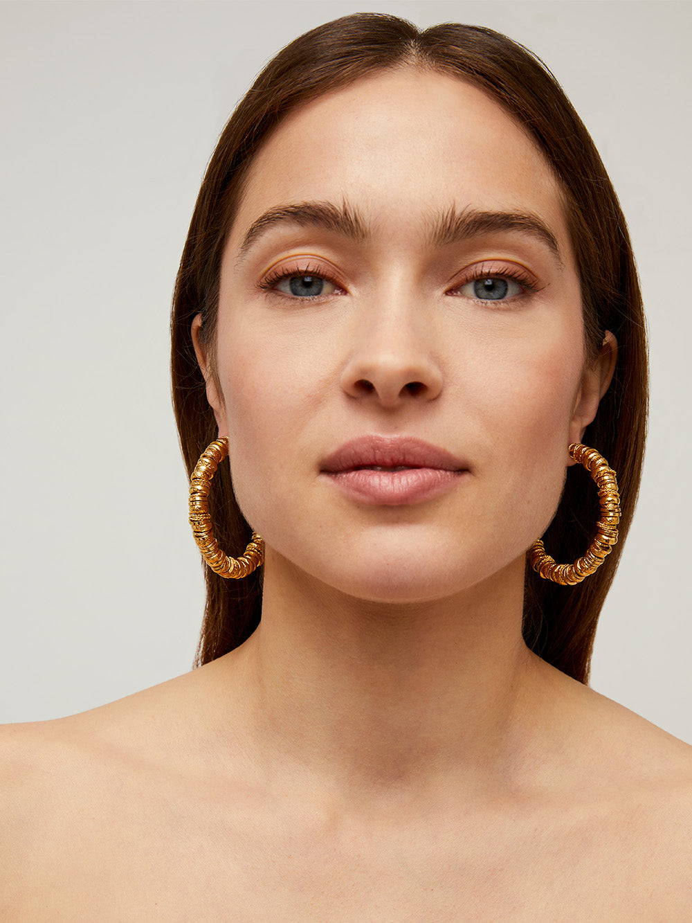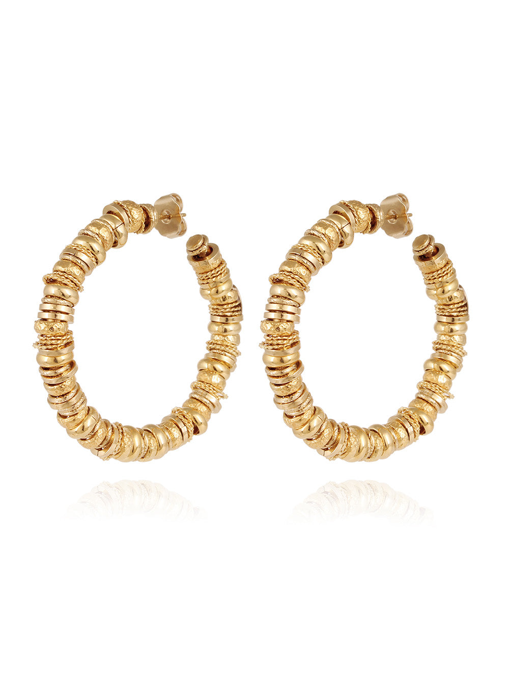 Born from the collaboration between Gas Bijoux and Françoise, the Flavia hoop earrings showcase craftsmanship with an accumulation of fine gold-plated, smooth, hammered, and engraved hoops. Reused in an upcycling approach, these elements, collected over 55 years, create a unique interplay of volumes.