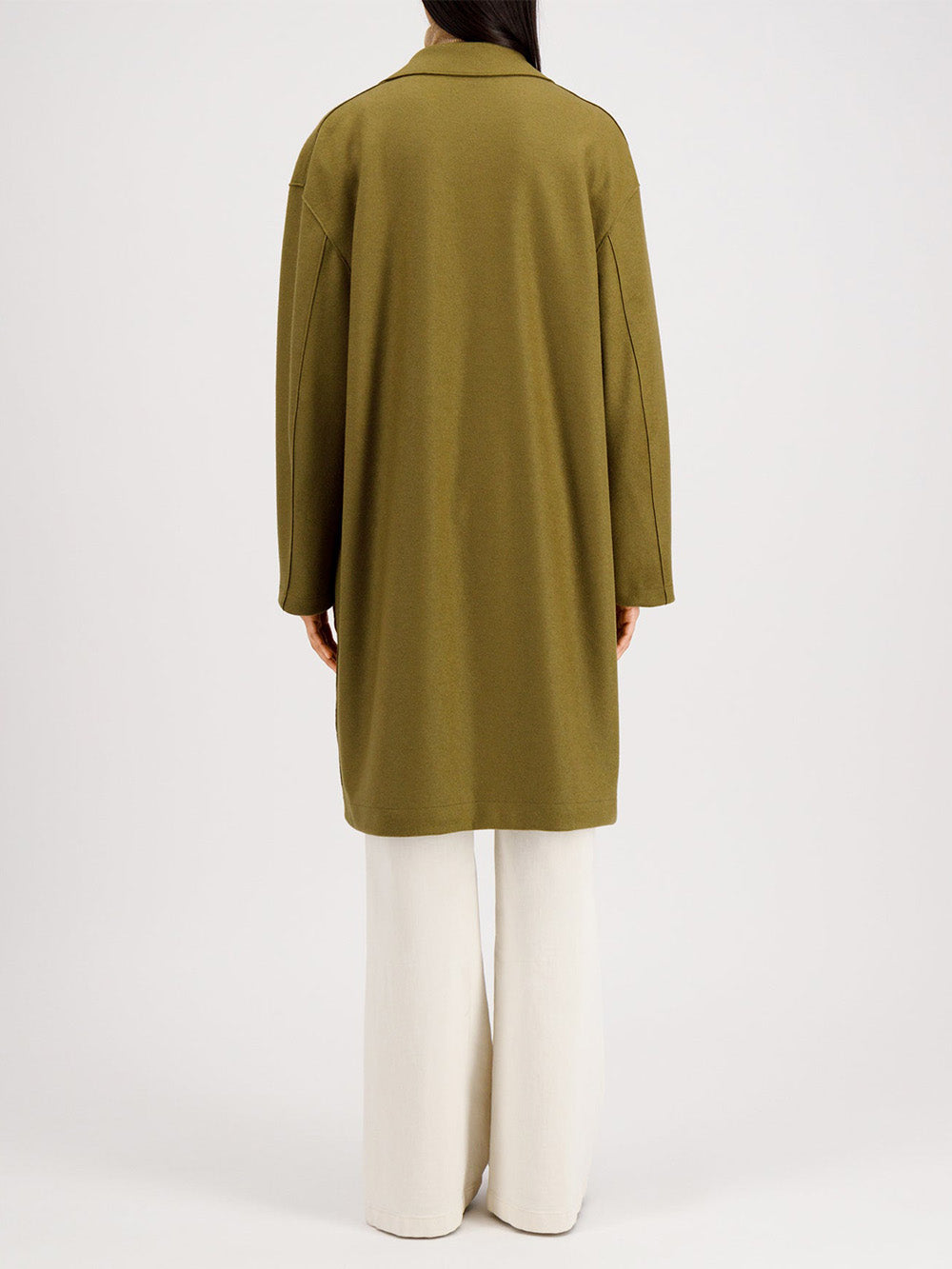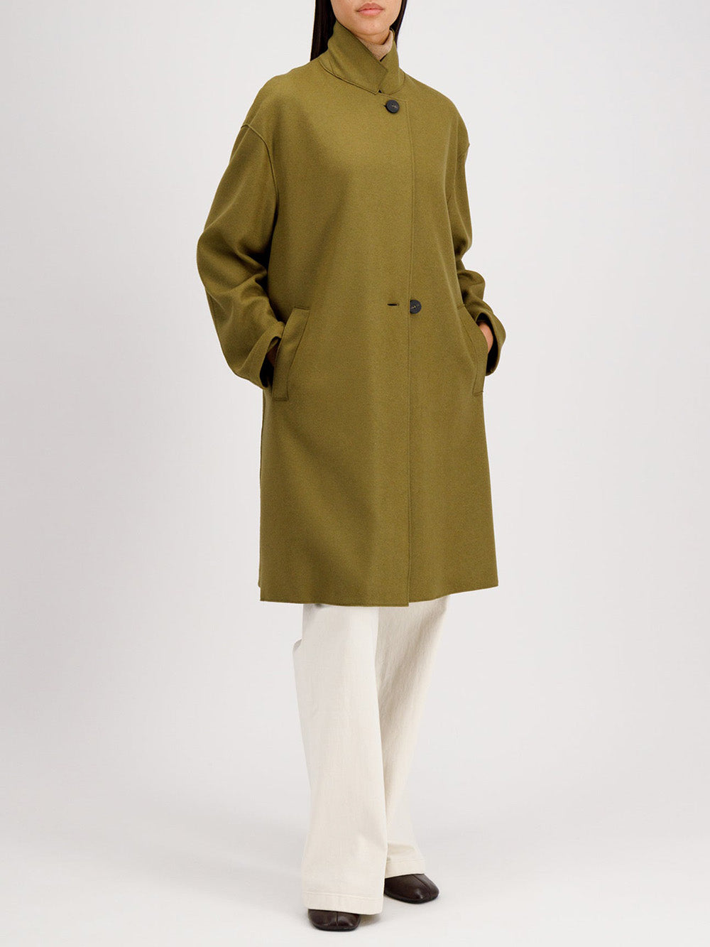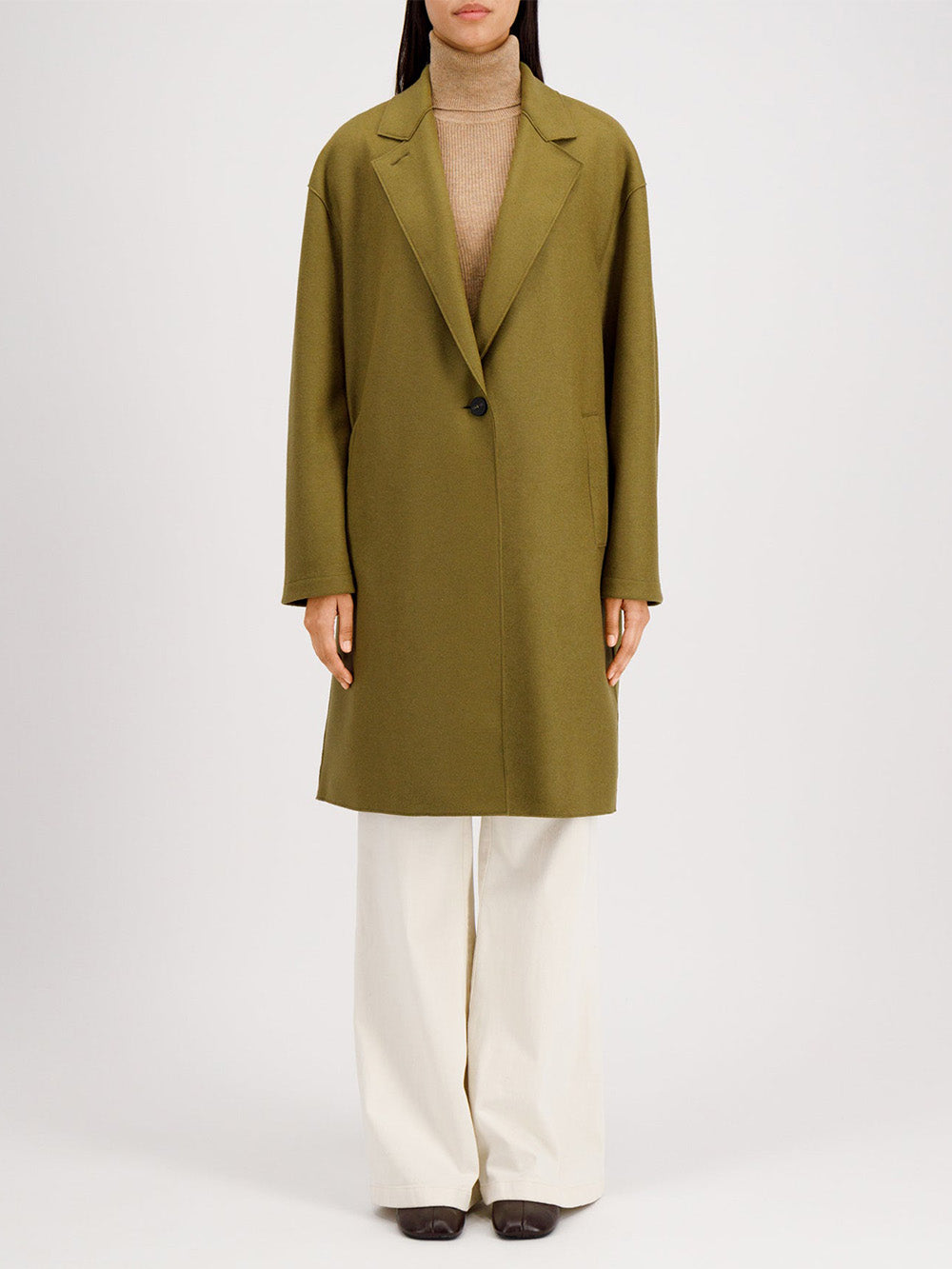 Oversized coat by Harris Wharf London made from an olive green wool and cashmere blend. A mid-length coat with dropped shoulders and a buttoned front closure.