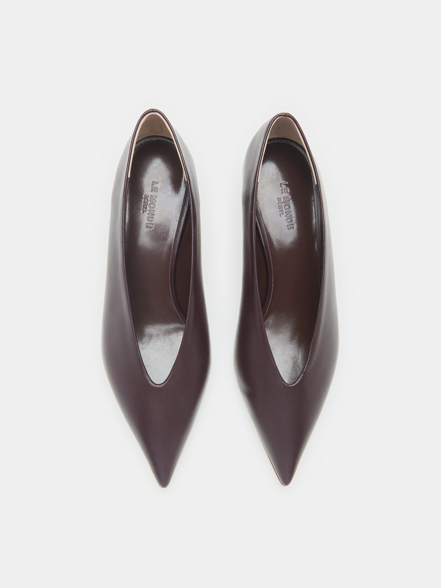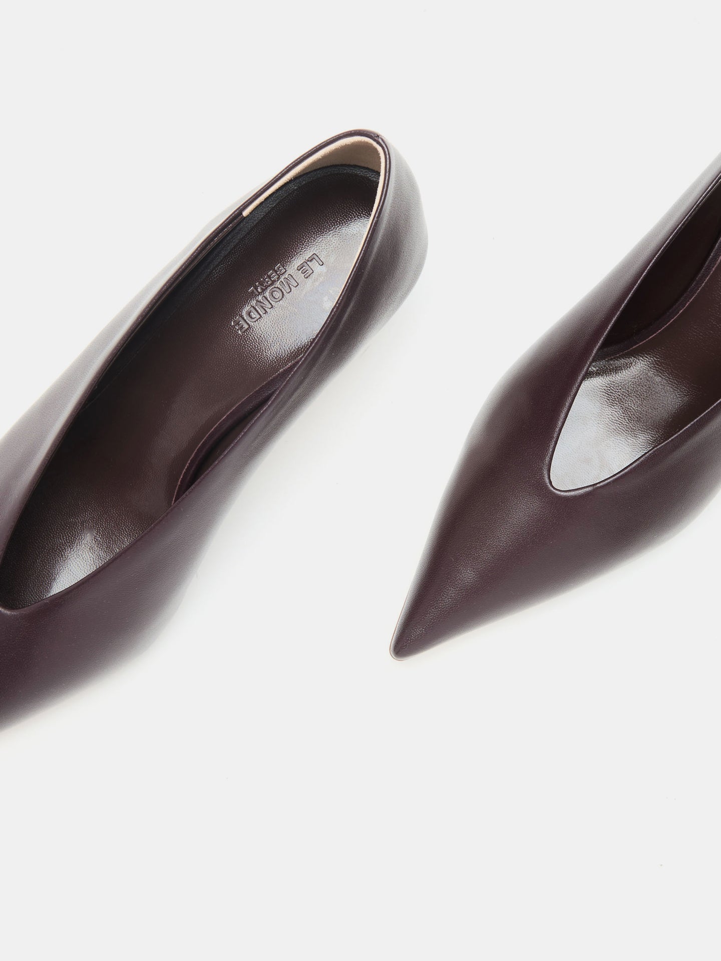 Babouche pumps by Le Monde Beryl, crafted from smooth plum-colored leather. A pair of shoes with low heels that taper to a point for a elongated leg.