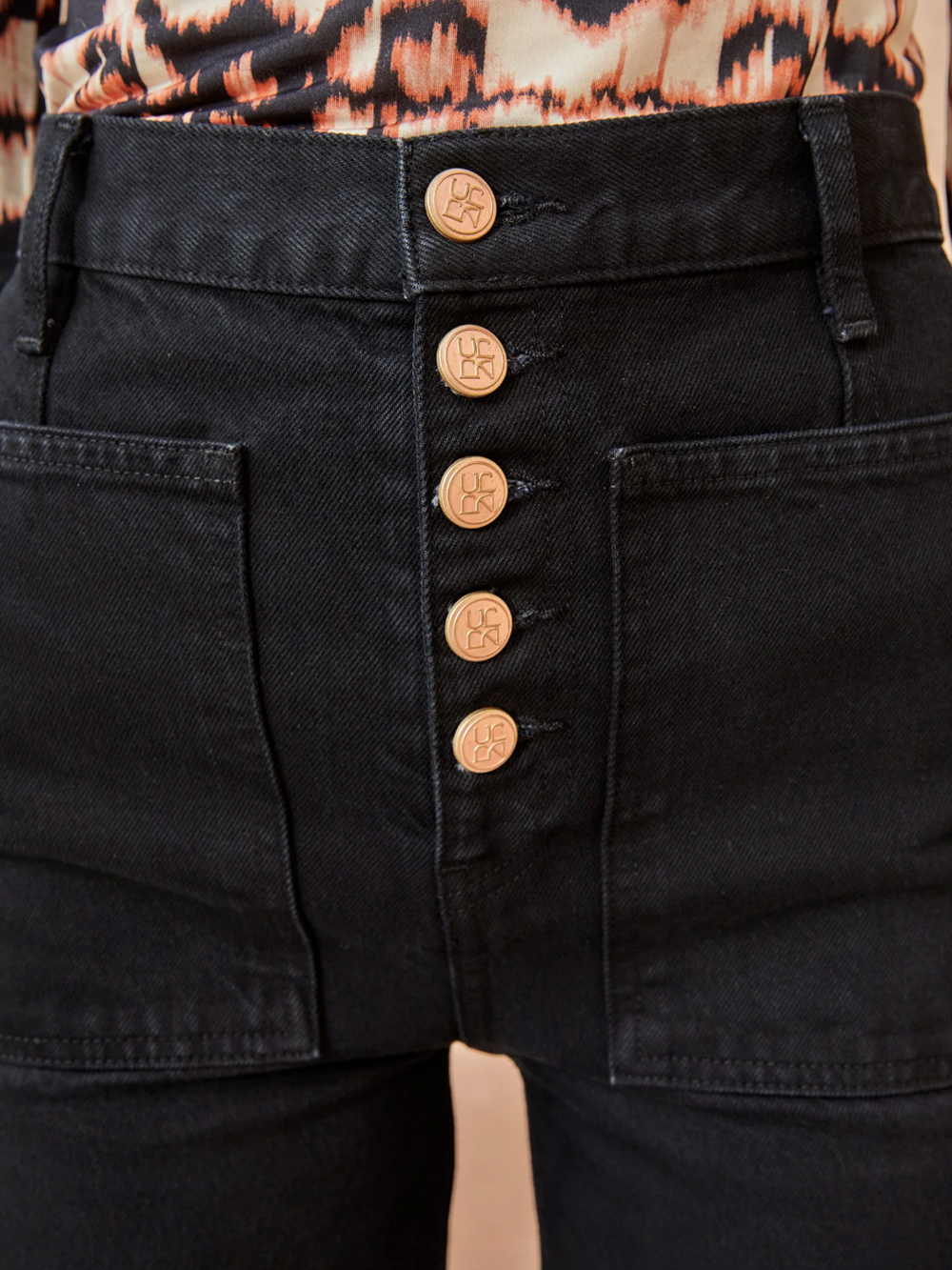 Lou jeans by Ulla Johnson Is responsibly made in Los Angeles, this jeans feature apparent central buttons on the front and are cut from non-tensible rigid black denim, making it a true favorite for eternity.