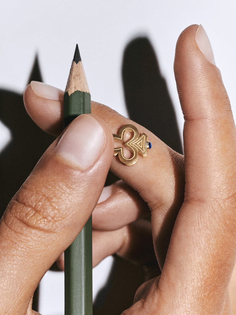 Marie Lichtenberg's Charm Clover earring is made from brushed 18-karat yellow gold set with a blue sapphire.