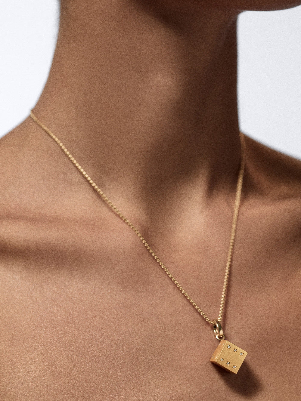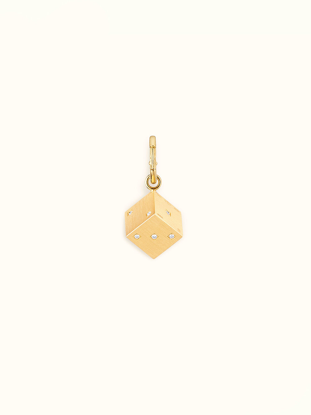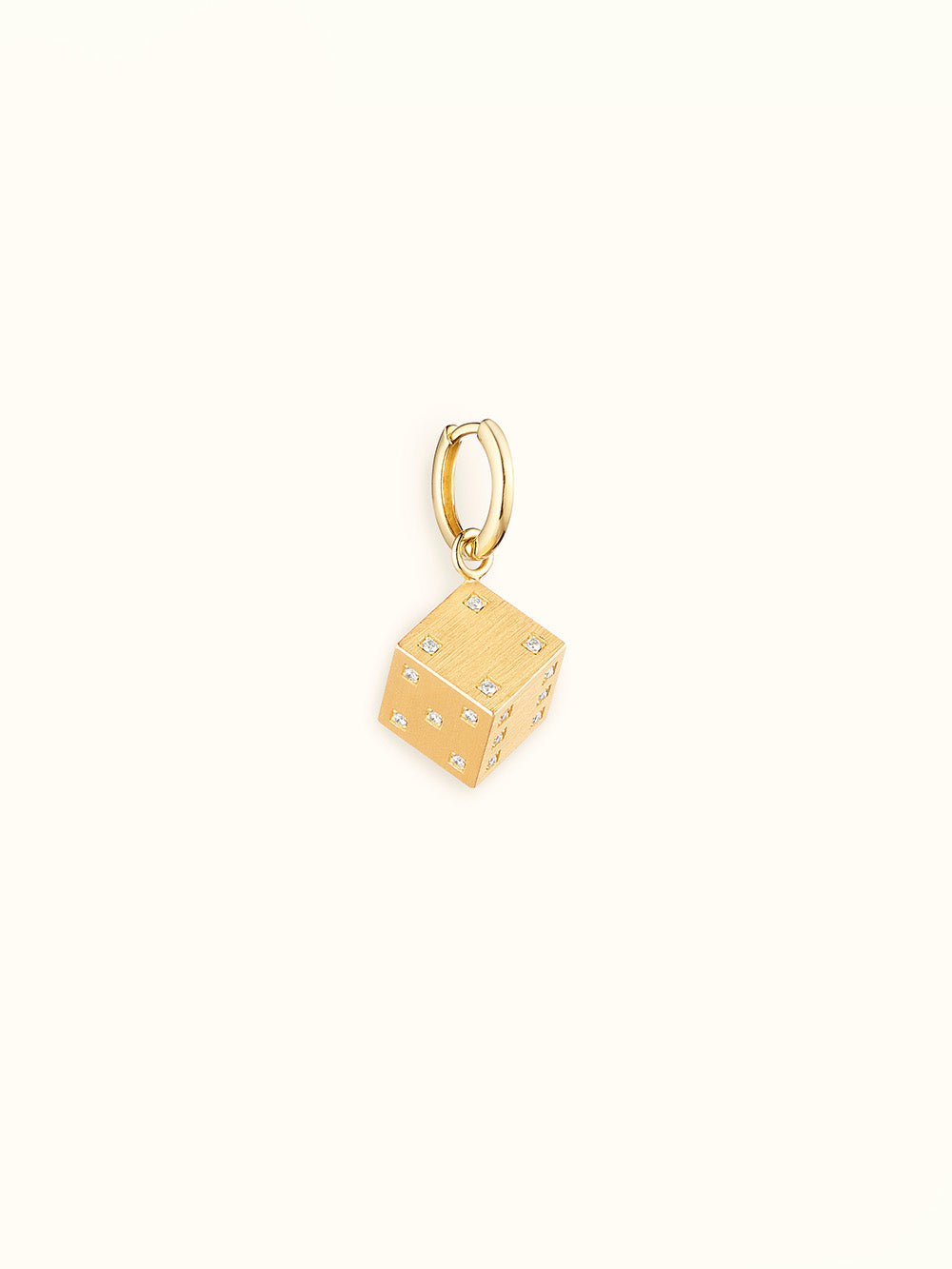 The pendant Dado 11mm signed Marie Lichtenberg is made in yellow gold brnothing 18 carats and set with white diamonds, like a playing dice. Sold with a clasp and a Creole, it can be worn either in pendant or in earrings.