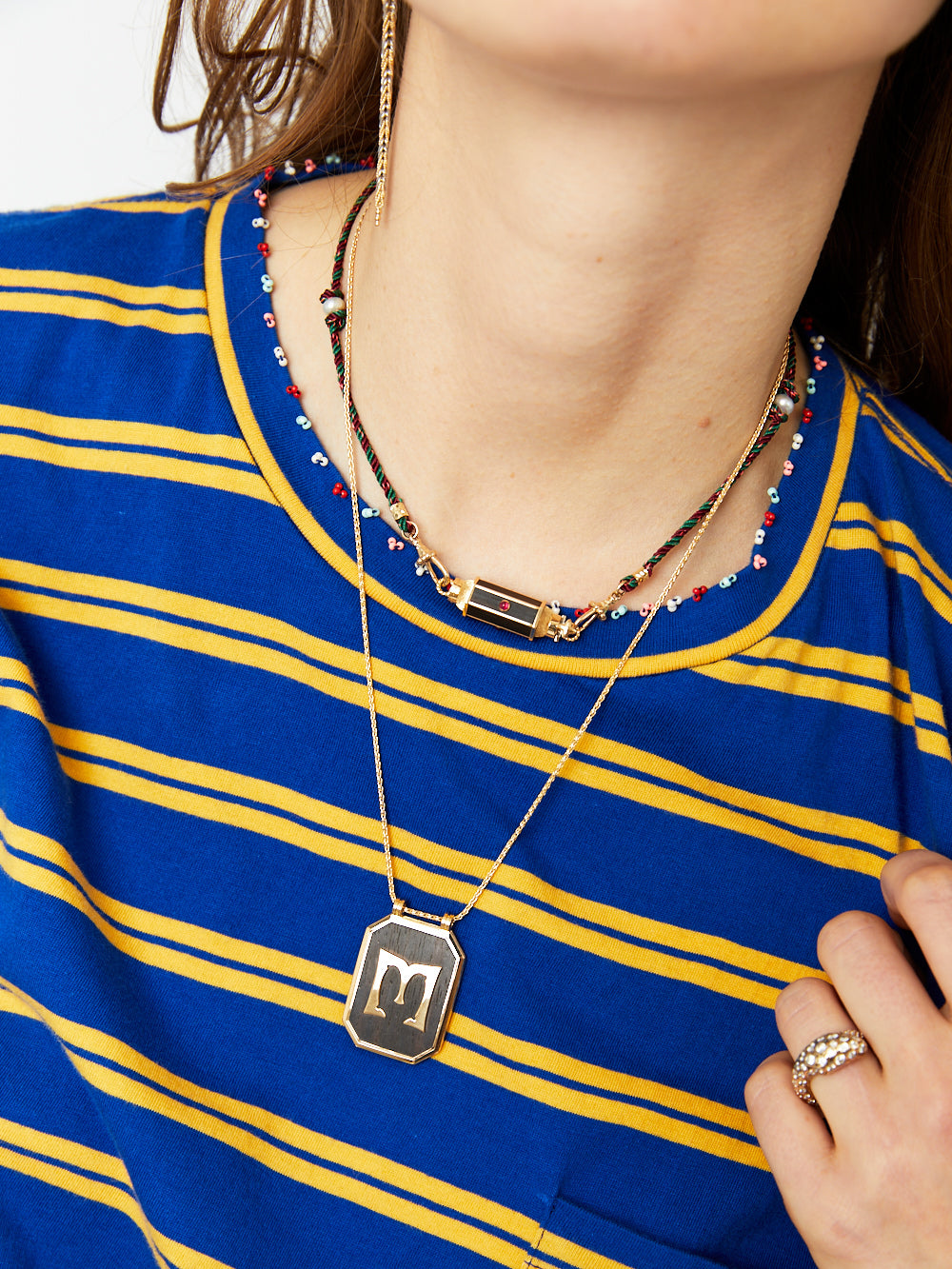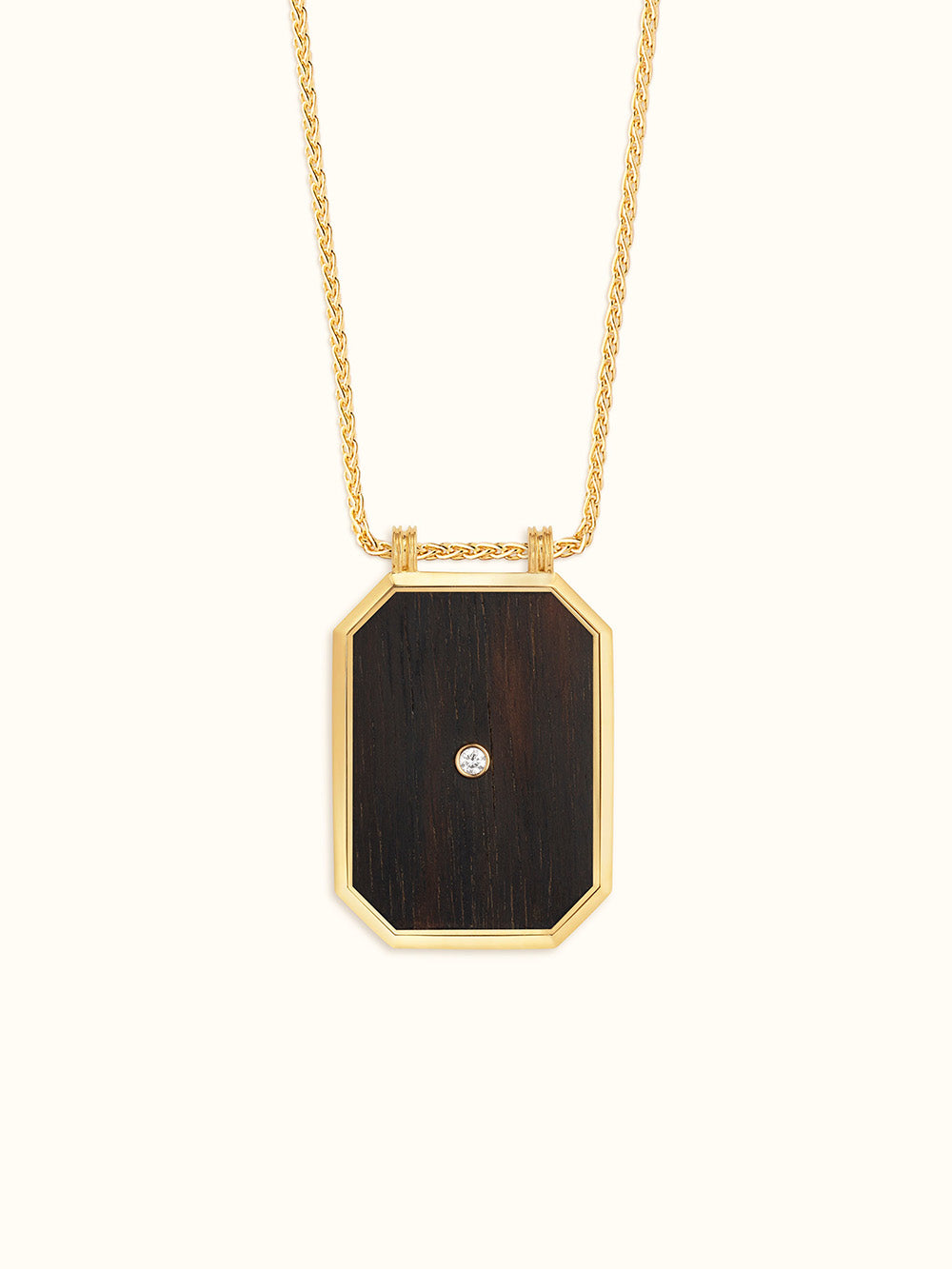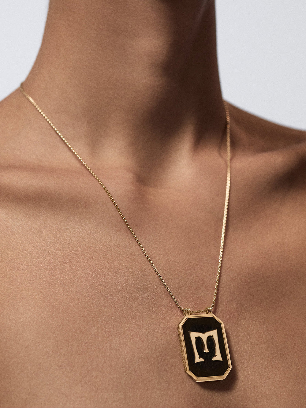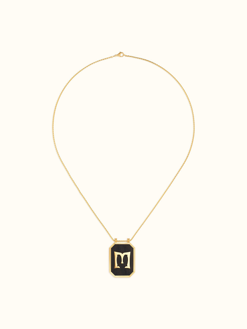 The Ebony Letter M scapular signed Marie Lichtenberg is made in 18-carat yellow gold. It consists of a black ebony plaque decorated with the letter M in gold, and a white diamond on the back. This scapular is sold on a 50 cm yellow gold chain.