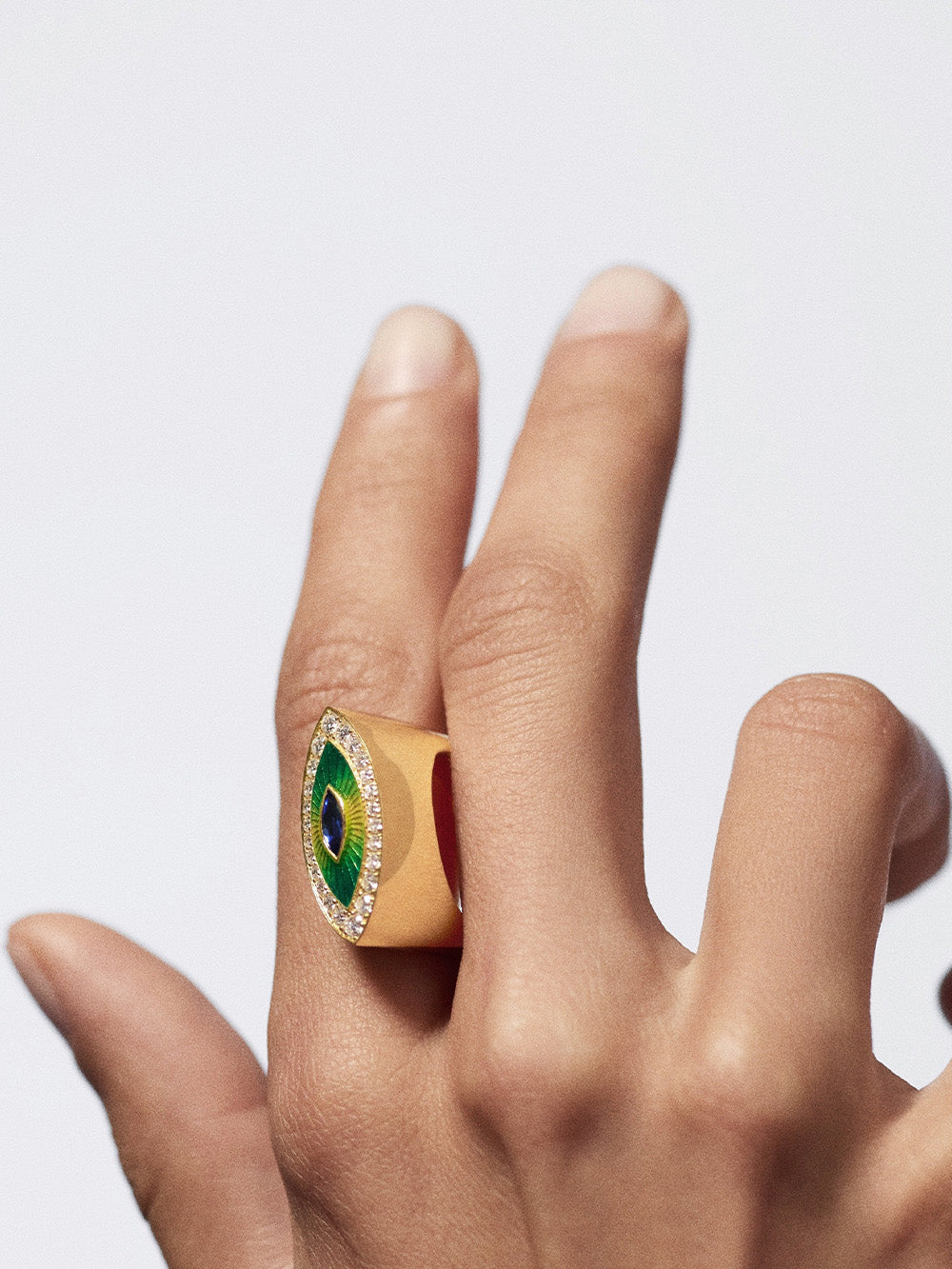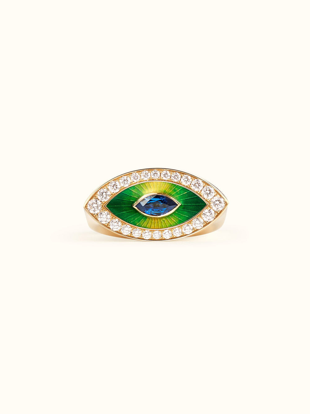 The Evil Eye Green ring by Marie Lichtenberg is made in 18-carat yellow gold. Made of enamel in shades of green and yellow, the ring is set with 24 white diamonds and a blue sapphire in its center, all taking the shape of an eye.