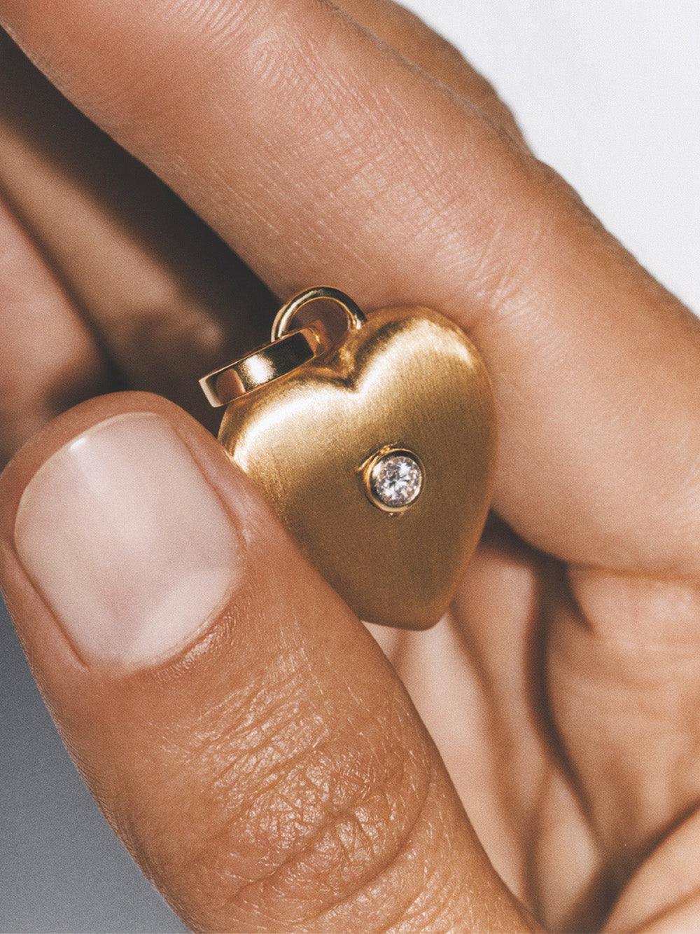 Modular Heart pendant by Marie Lichtenberg made of 18-carat brushed yellow gold set with a white diamond in its center. A charm sold with a ring and a clasp to be worn as a pendant or earring.