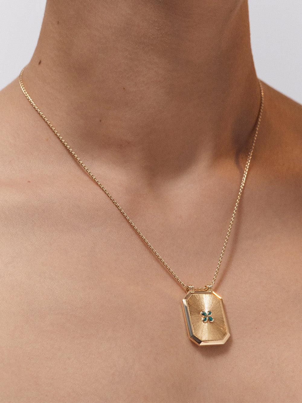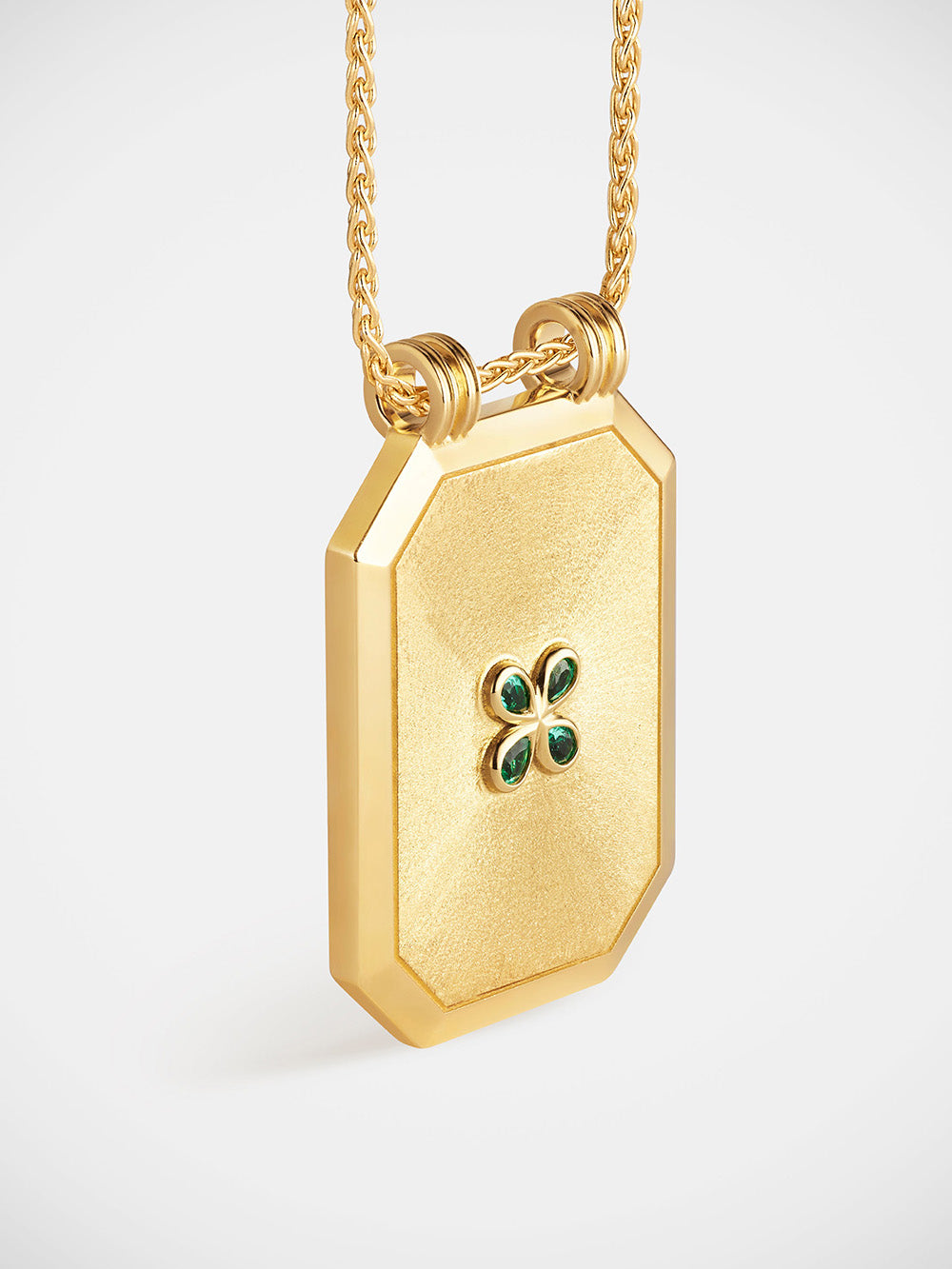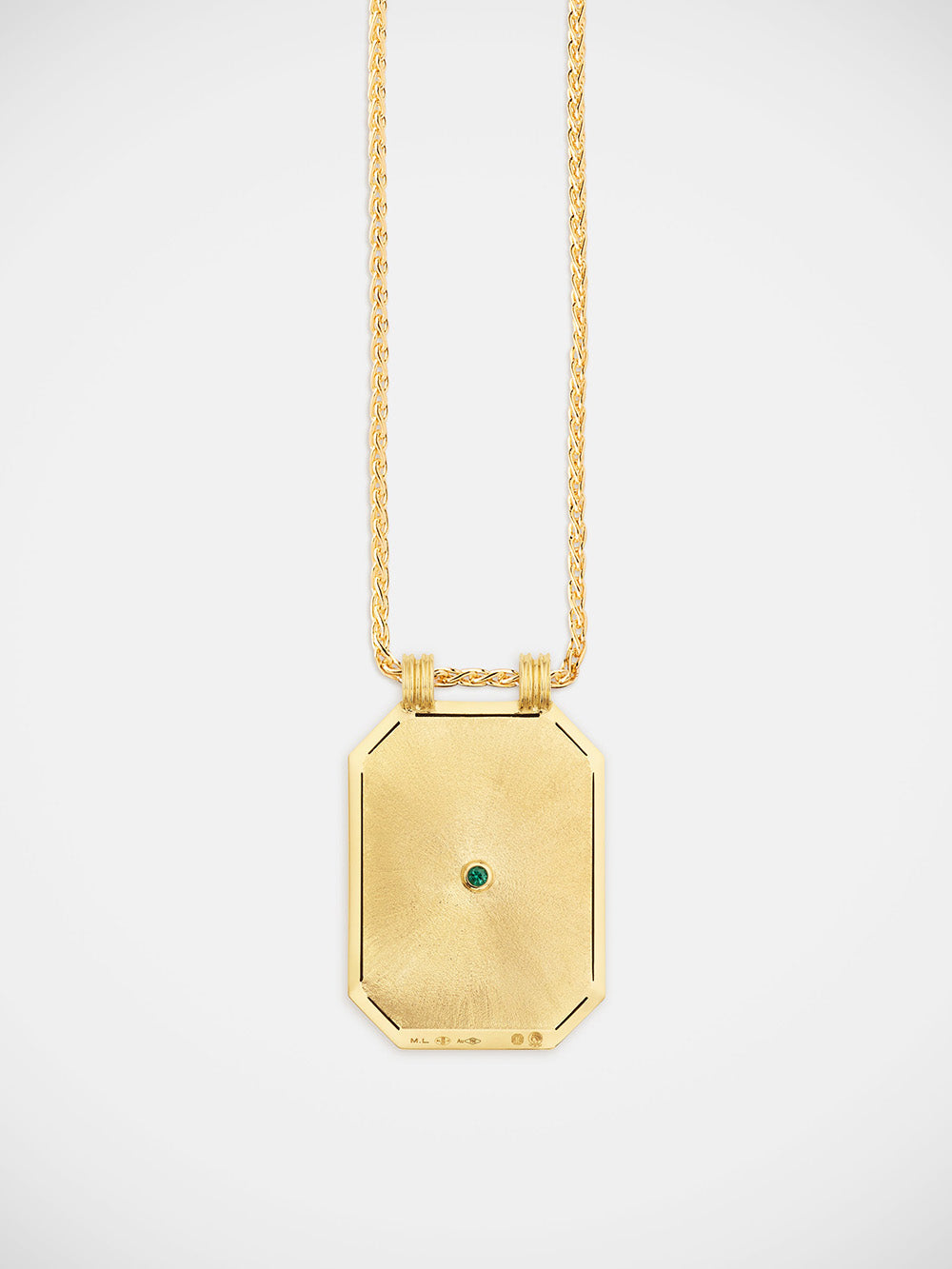Luck scapular by Marie Lichtenberg crafted in 18-carat yellow gold in brushed gold set with four small pear-cut emeralds forming a four-leaf clover as well as a round-cut emerald on the back. - Weight: 11 grams - Emeralds, 0.11 carat - Dimensions: 26mm x 19.5mm x 2mm - Sold on a 44cm spike chain - Part guaranteed for 2 years from the date of purchase upon presentation of the invoice - Sent in a jewelry box with certificate of authenticity