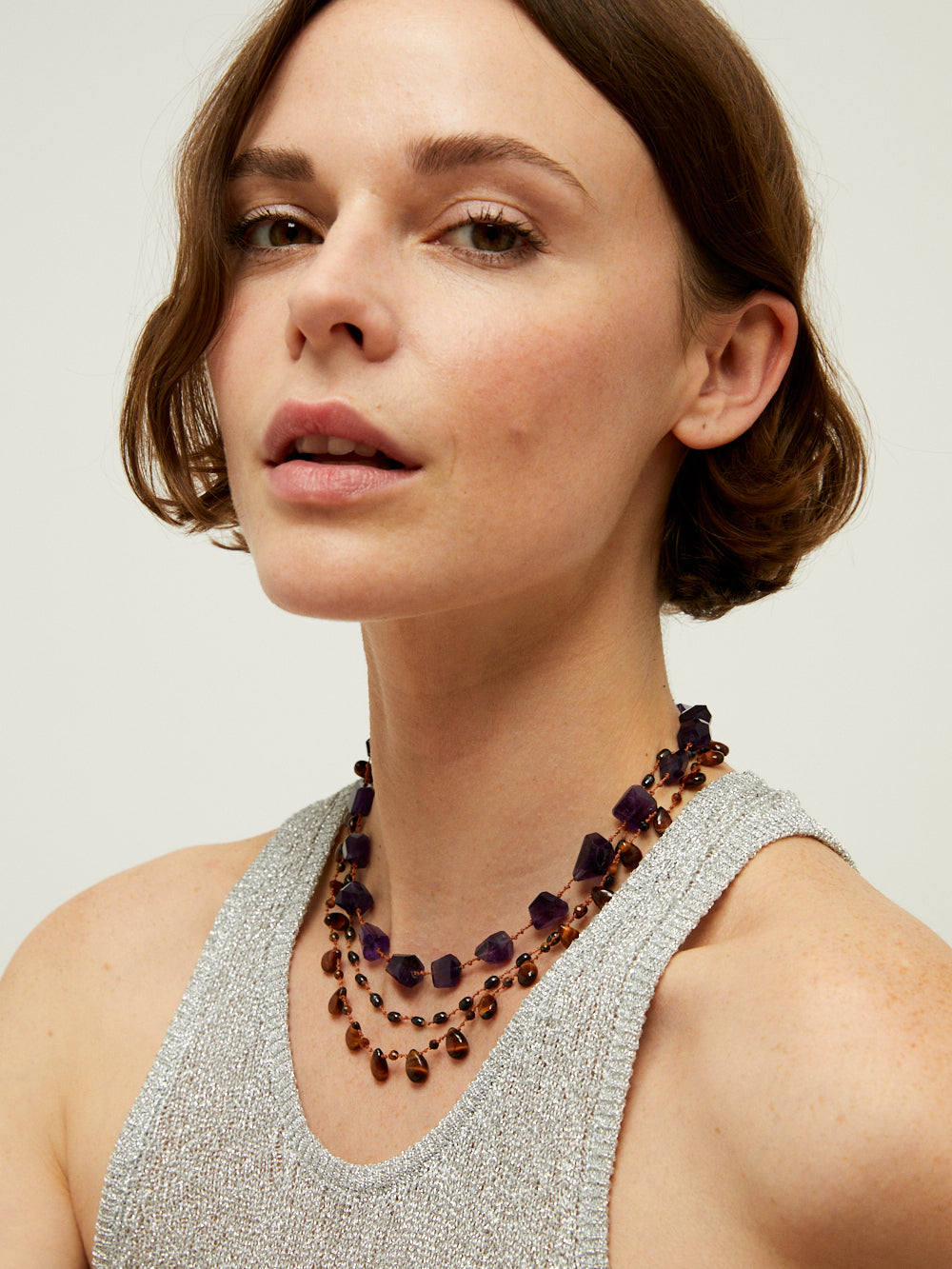 Bird Mini Black necklace by Ivarène made from small gray freshwater pearls mounted on a copper-colored nylon cord.