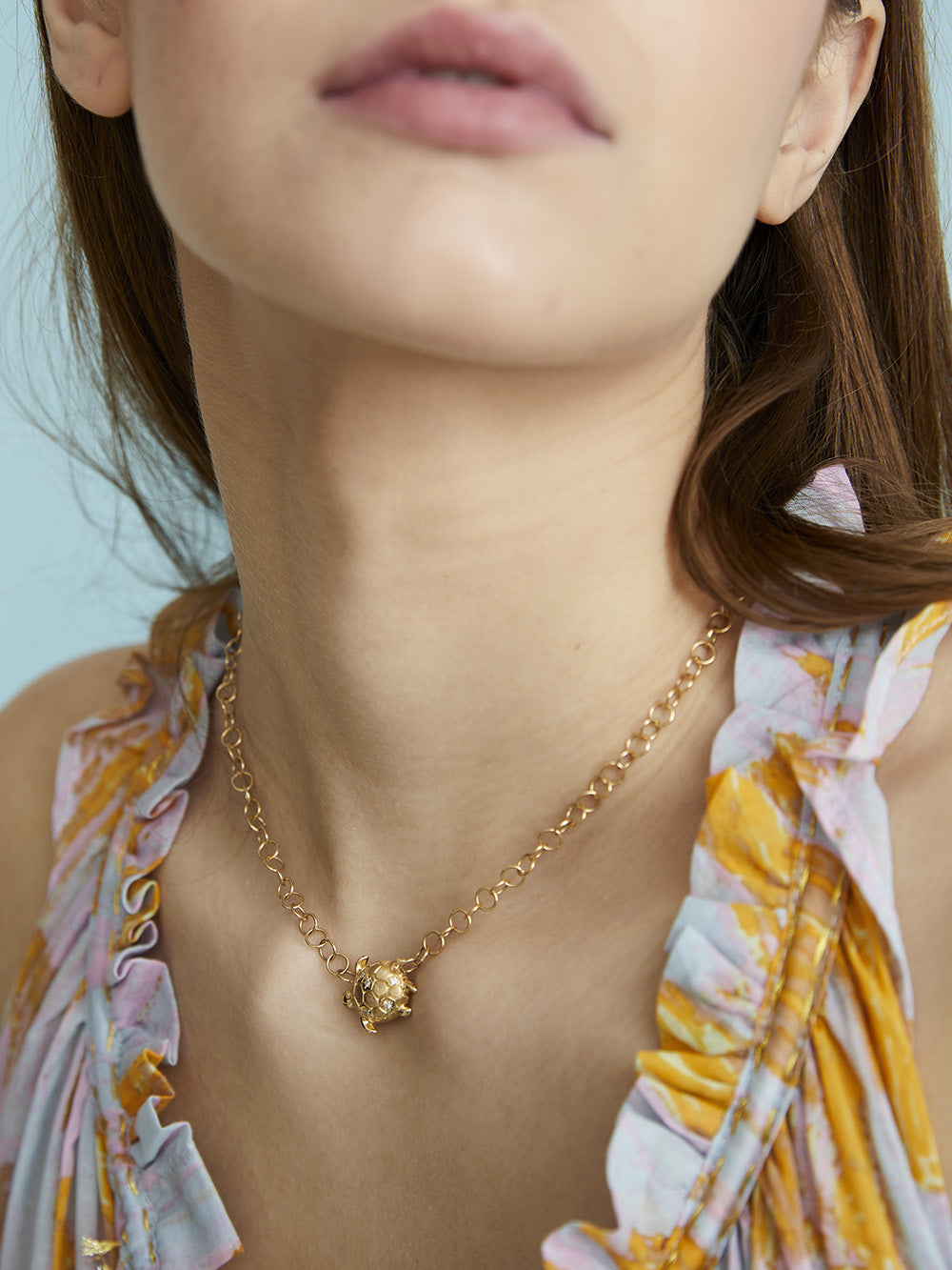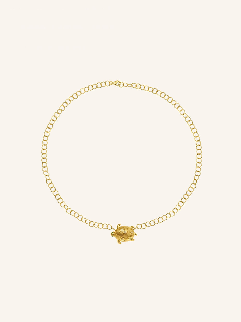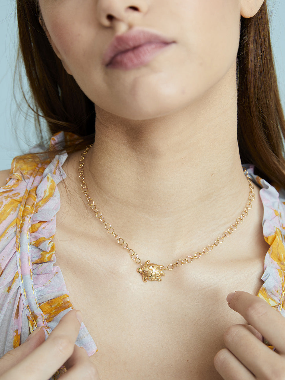 This Donatello choker necklace by Salomé Rico is a piece of jewelry made from recycled 18-carat yellow gold. It is decorated with a small turtle set with rainbow sapphires and tsavorites at eye level. It is made in the brand's Parisian workshops.