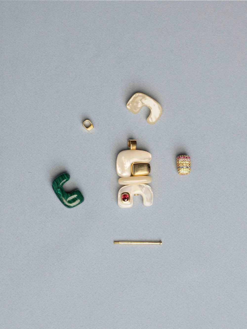 Éléments Totem de la marque Joelle Kharrat. Des pièces en bois, en or ou encore en malachite, parfois incrustées de pierres précieuses et semi-précieuses pour composer un bijou coloré et unique.
