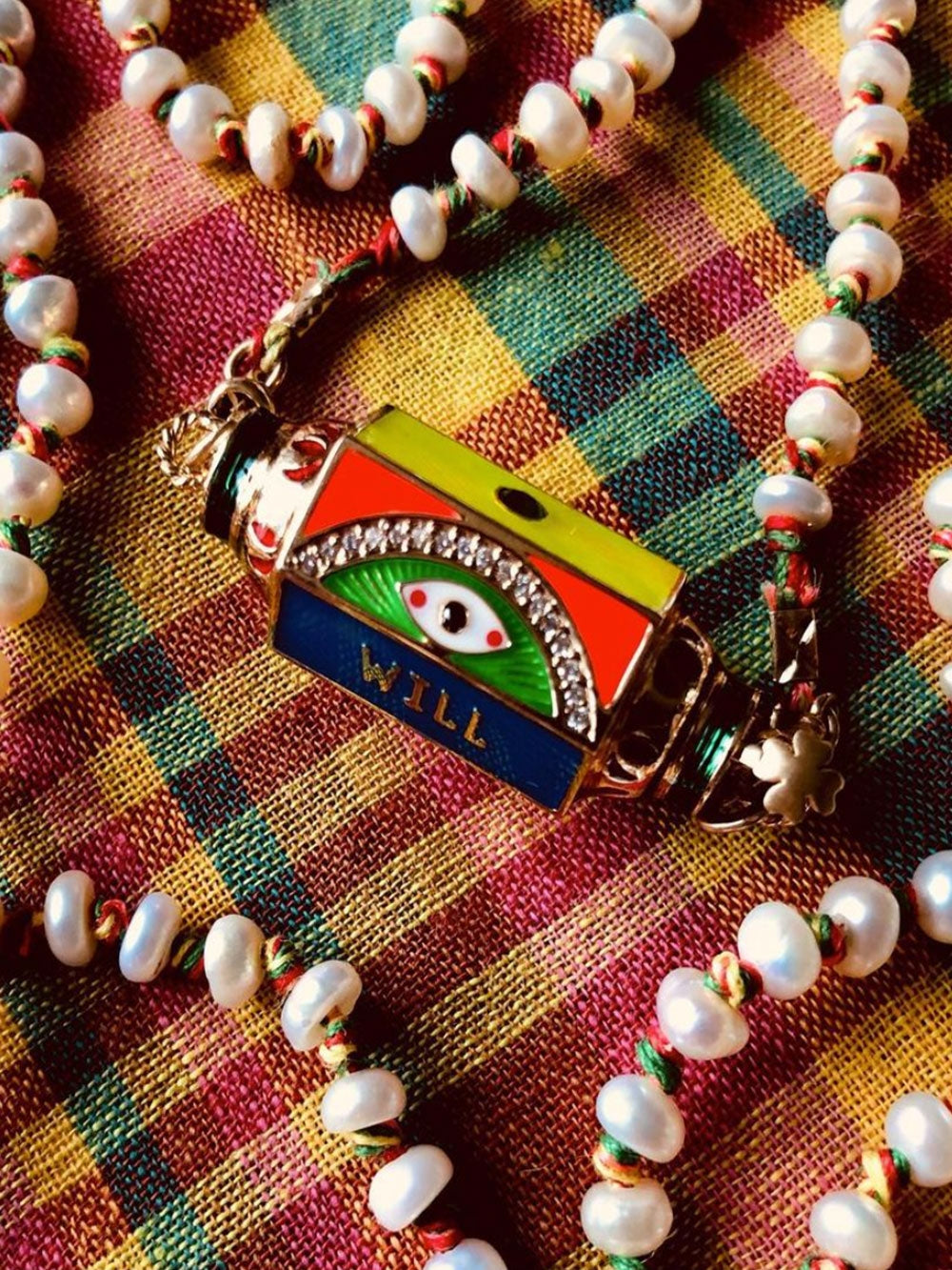 Mauli Full Pearl link by Marie Lichtenberg. This long cord is decorated with beads and closes with two carquetons which allow Marie Lichtenberg locks or scapulaires to be clipted. Made in Italy