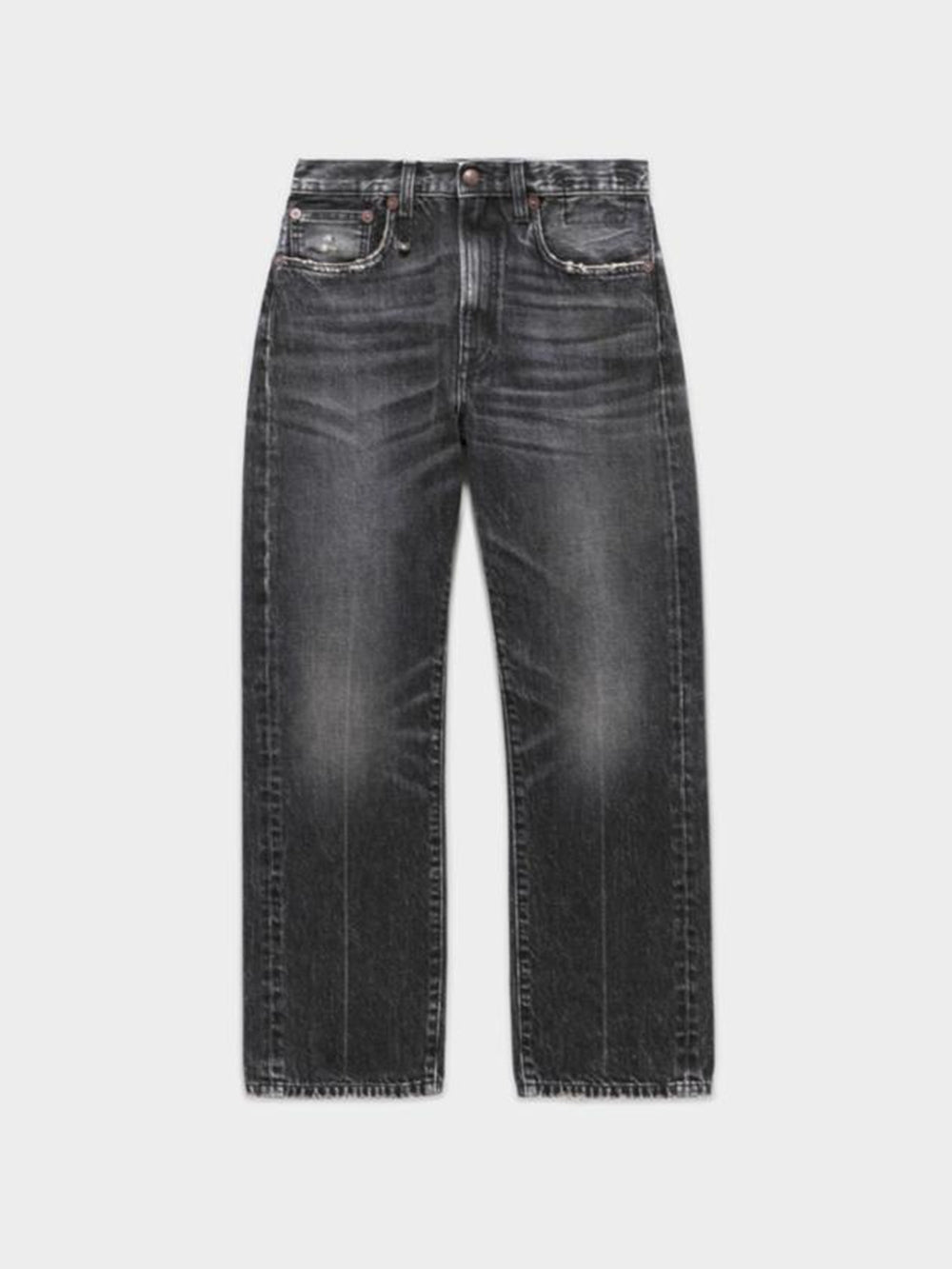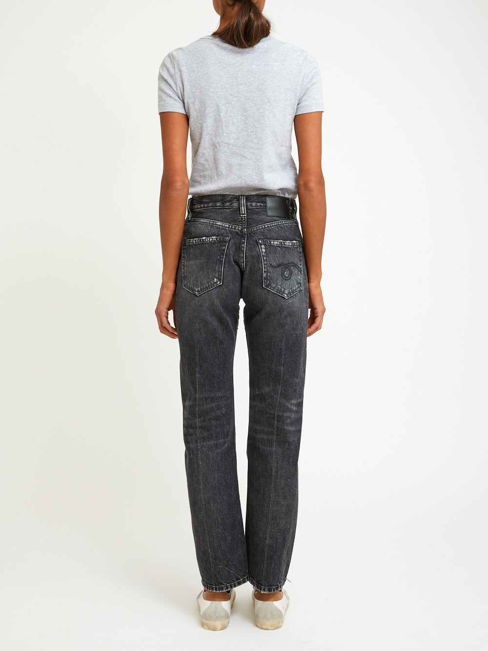 R13 Courtney Slim Jeans. These faded black denim jeans have a straight fit and a mid-rise waist.