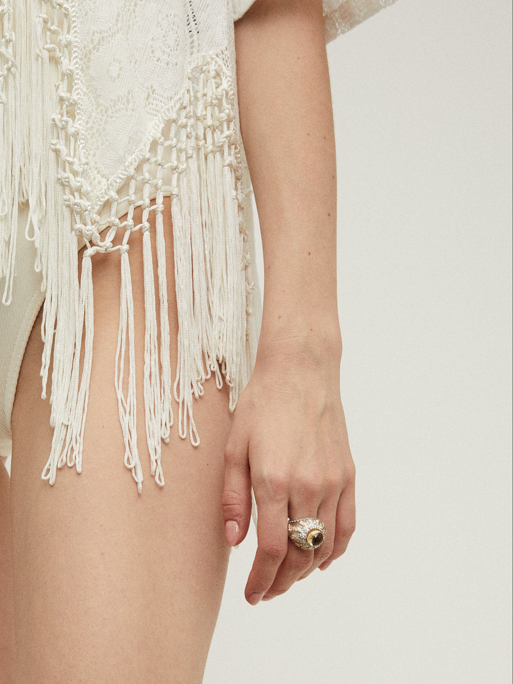 Boli Tie ring by Monoki crafted from 14-carat yellow gold set with diamonds and featuring a yellow topaz cabochon. A cocktail ring inspired by the iconic accessory of cowboys in the American Wild West.