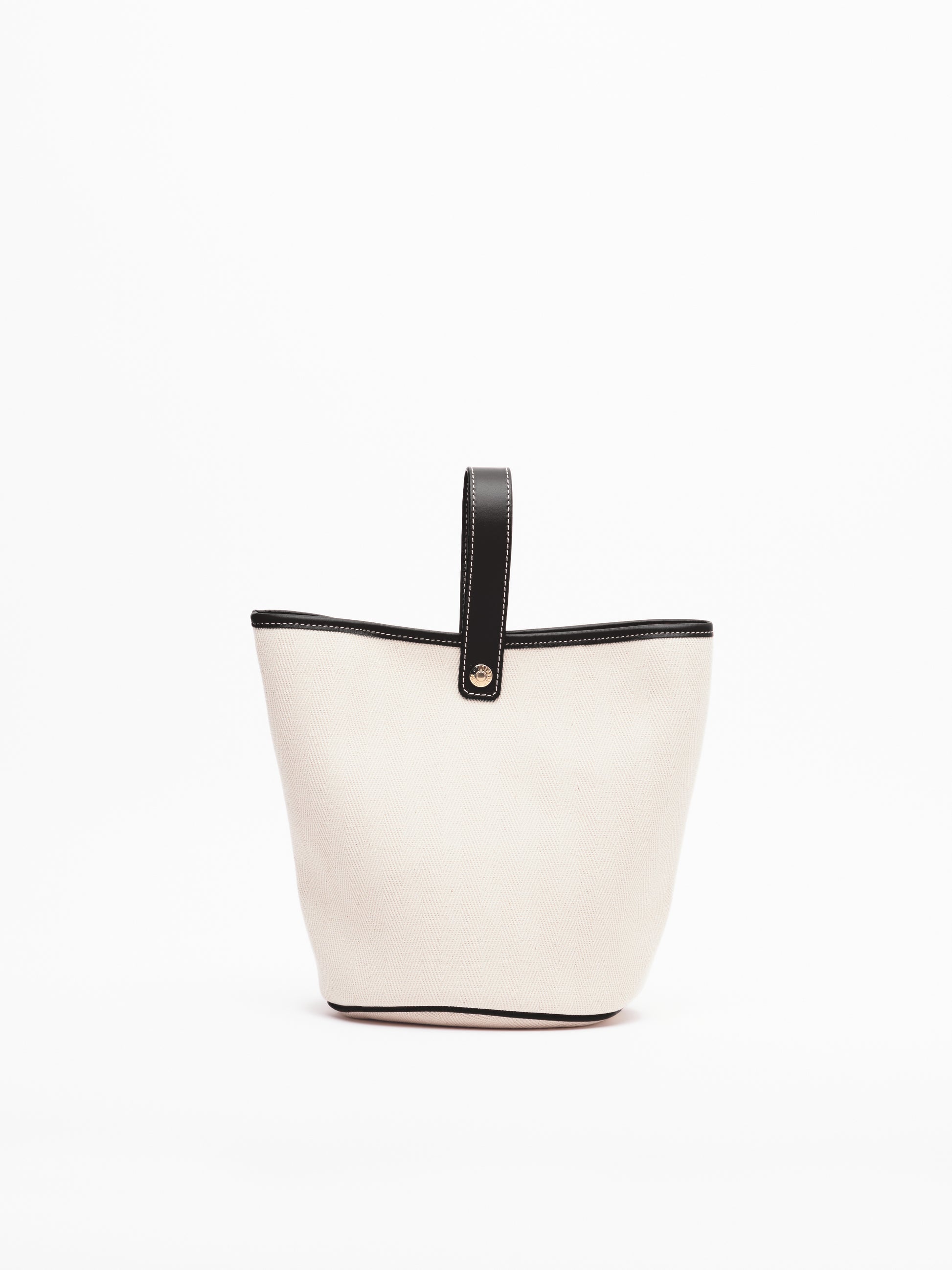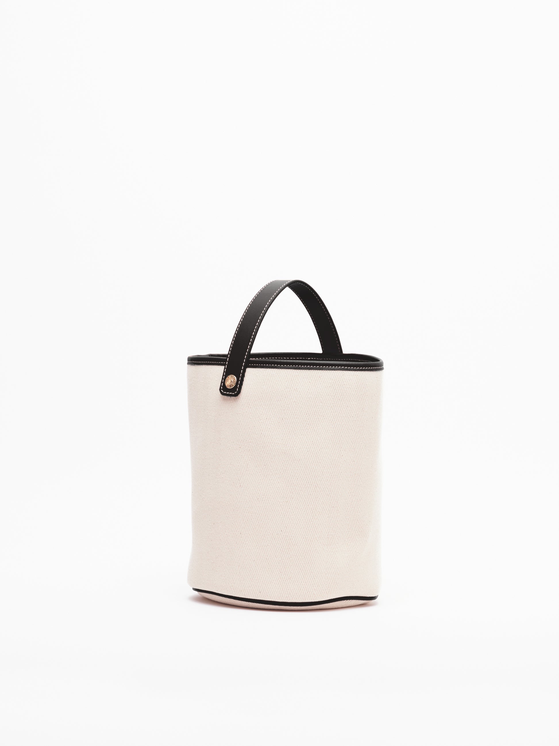 Harbor Canvas bag by Rue de Verneuil made from cream-colored wool canvas. A chic bucket bag with contrasting black leather trim.