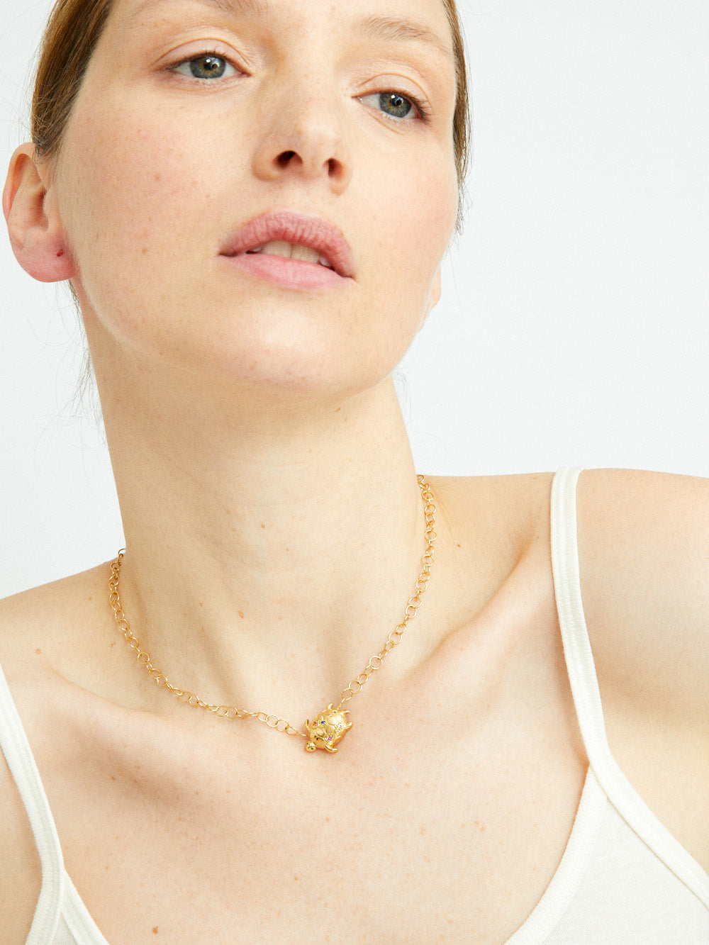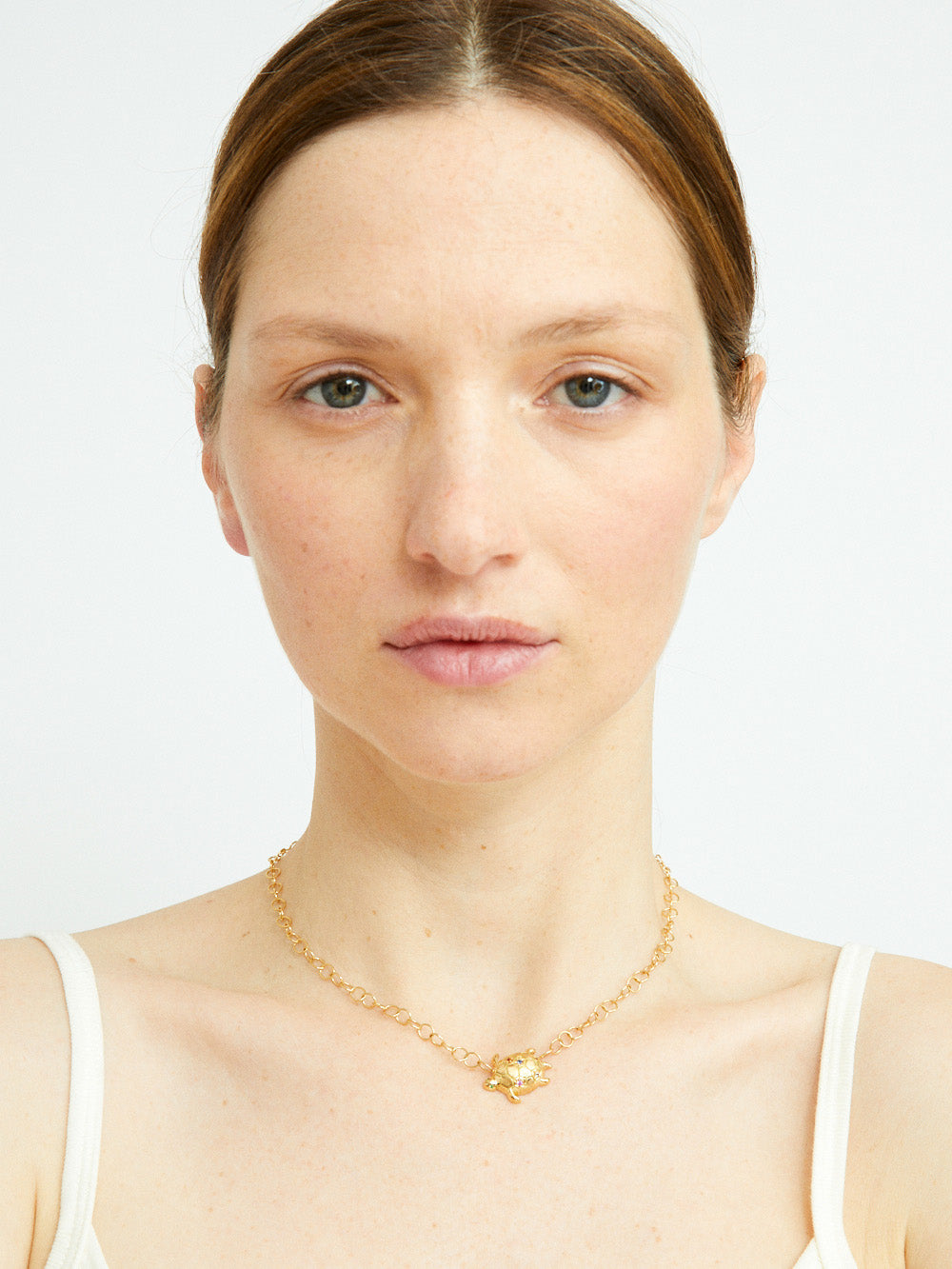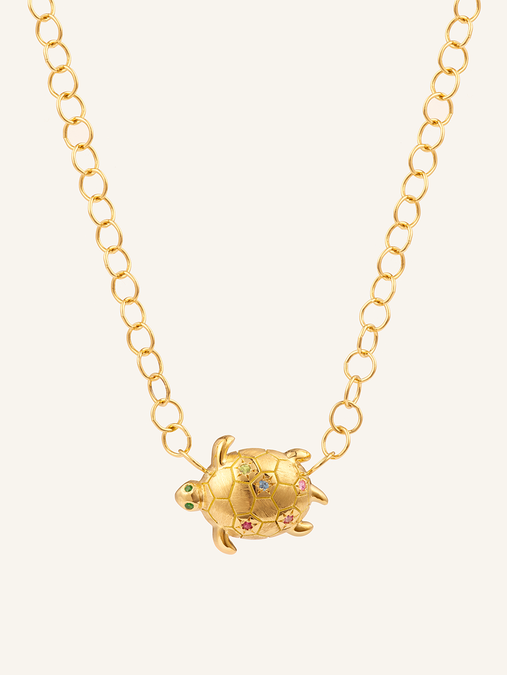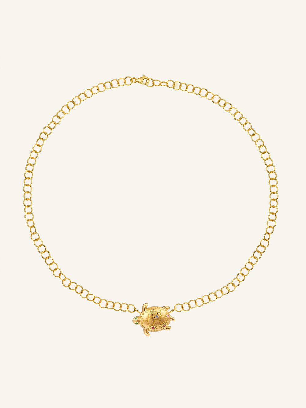 This Donatello choker necklace by Salomé Rico is a piece of jewelry made from recycled 18-carat yellow gold. It is decorated with a small turtle set with diamonds and tsavorites at eye level. It is made in the brand's Parisian workshops.