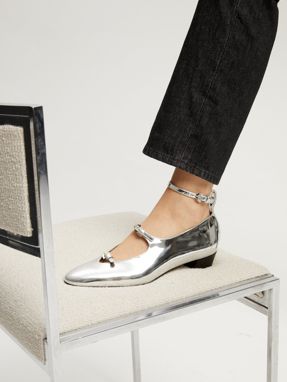Mary-Jane La Bambola by A Di Gaeta, crafted from silver patent Italian leather. A pair of ballet flats with three adjustable straps, including a removable ankle strap.