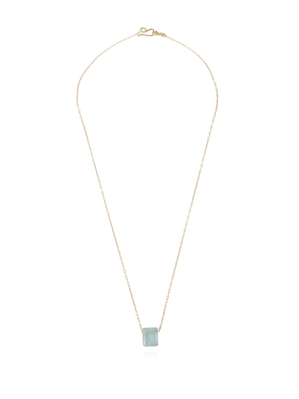 This Chiclet necklace by TenThousandThings features an aquamarine pendant on a fine 18-carat yellow gold chain. A chic, minimalist piece of jewellery.