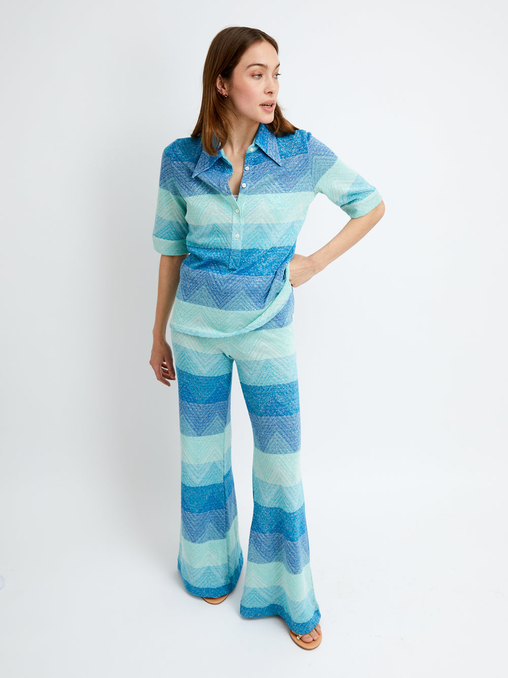 Giudecca Vague Rose pants by La Prestic Ouiston, crafted from viscose and lurex in a shade of blue. A palazzo cut, fitted at the waist.