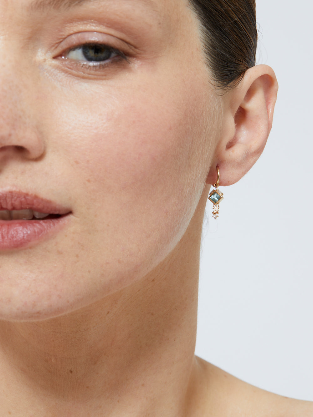 This Céline Daout earrings in yellow gold consists of a blue tourmaline cut in diamond, with two diamond-shaped diamonds on top and a star diamond below.