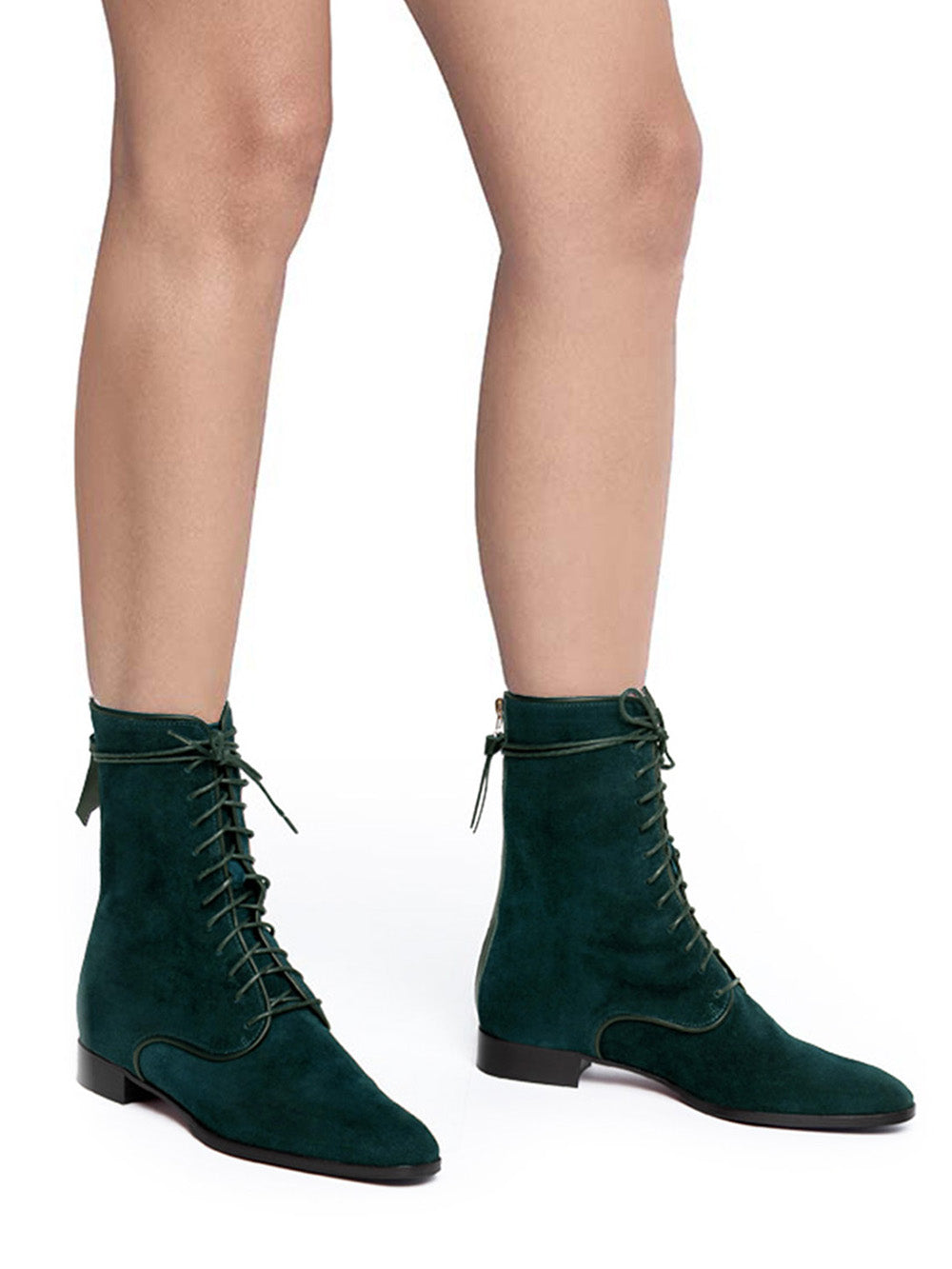 L'Audace ankle boots by A Di Gaeta, crafted from Italian crosta wax suede in forest green. A pair of ankle boots with almond toe laces at the front.