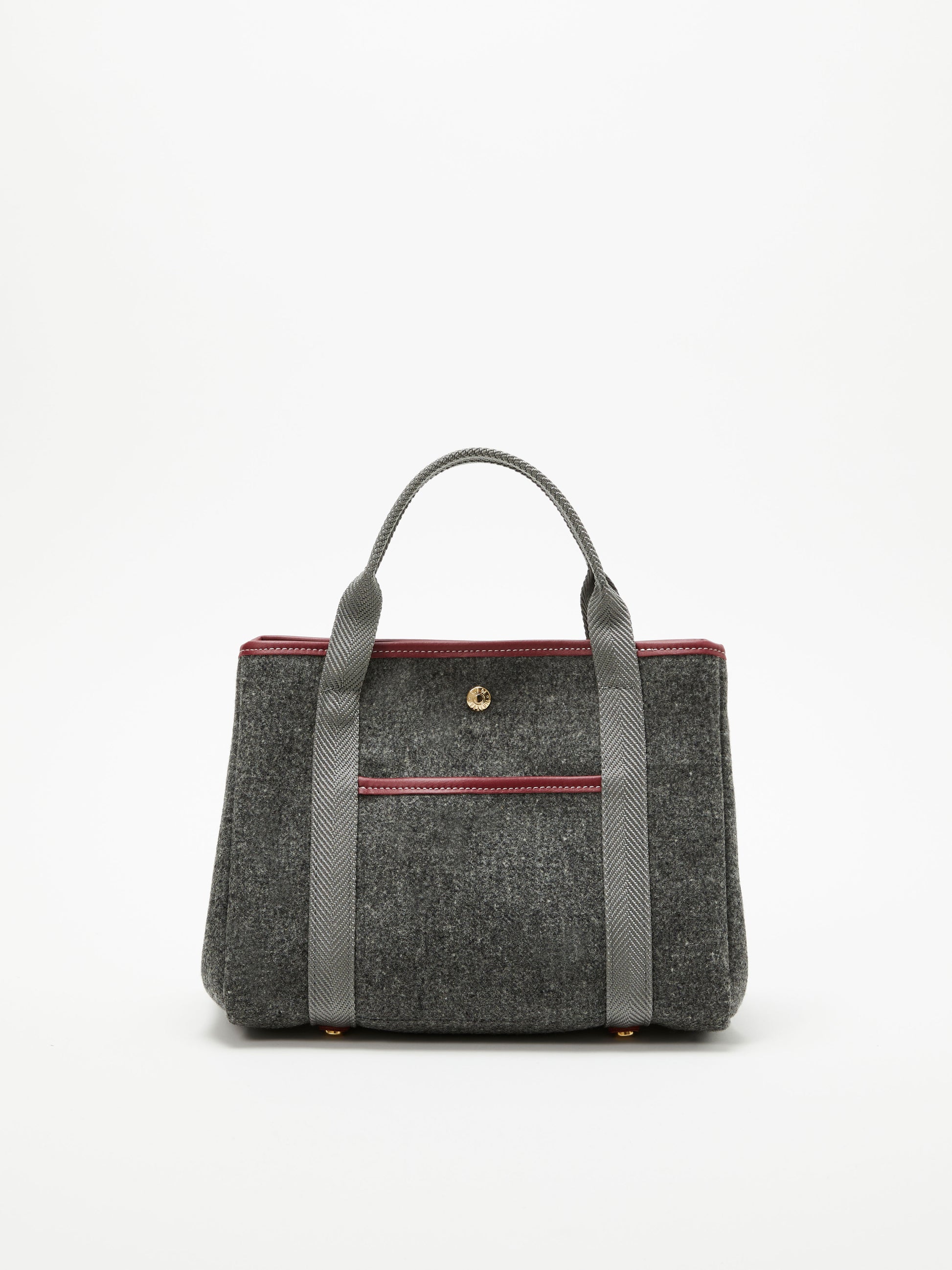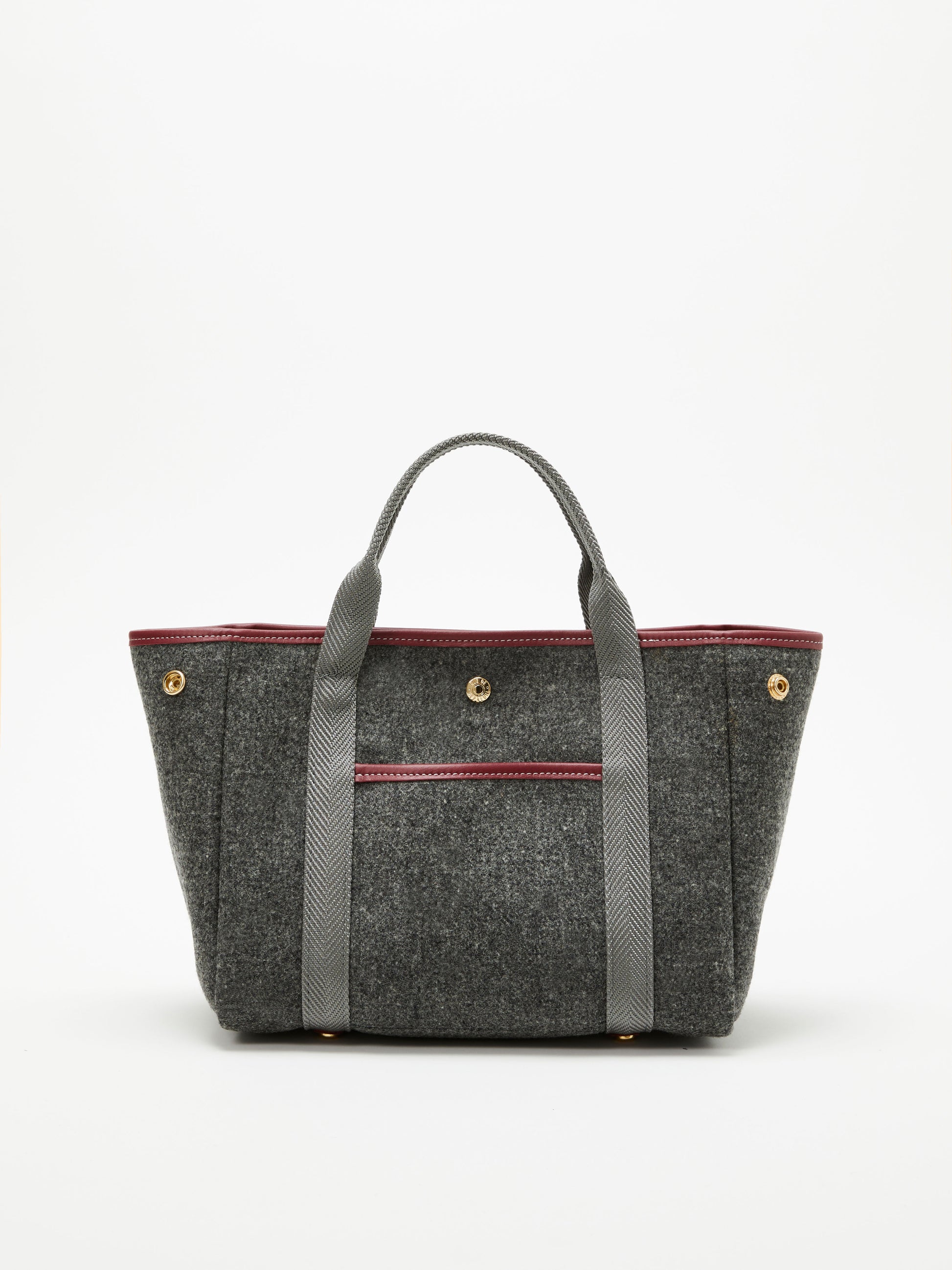Rue de Verneuil's Traversée S Pocket bag is crafted from heather gray flannel with contrasting burgundy leather trim. It comes with an additional front pocket.