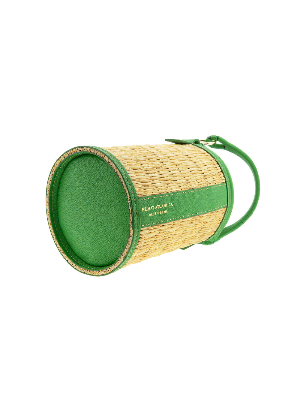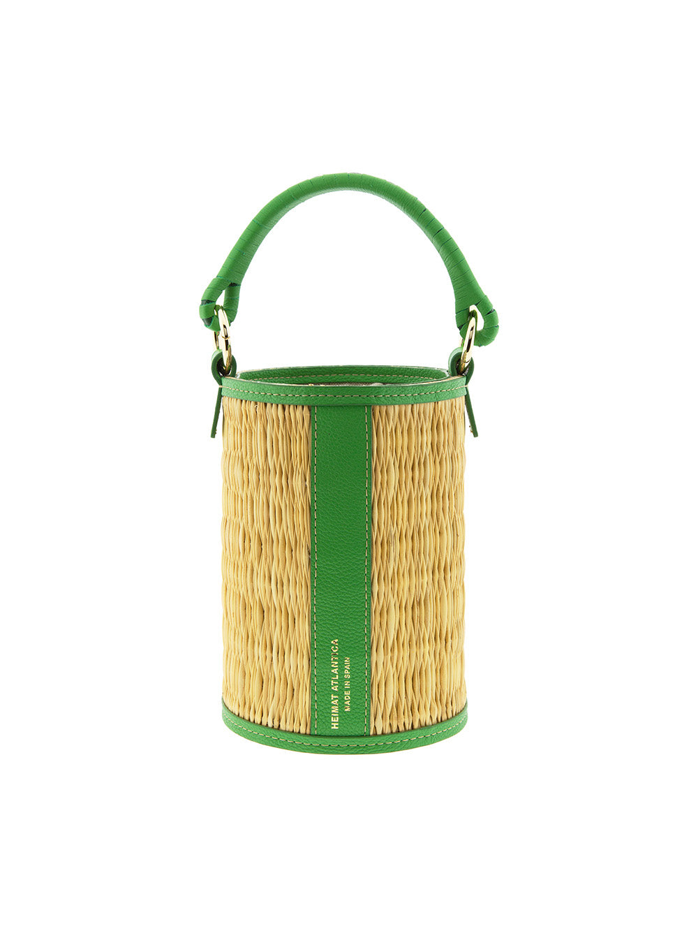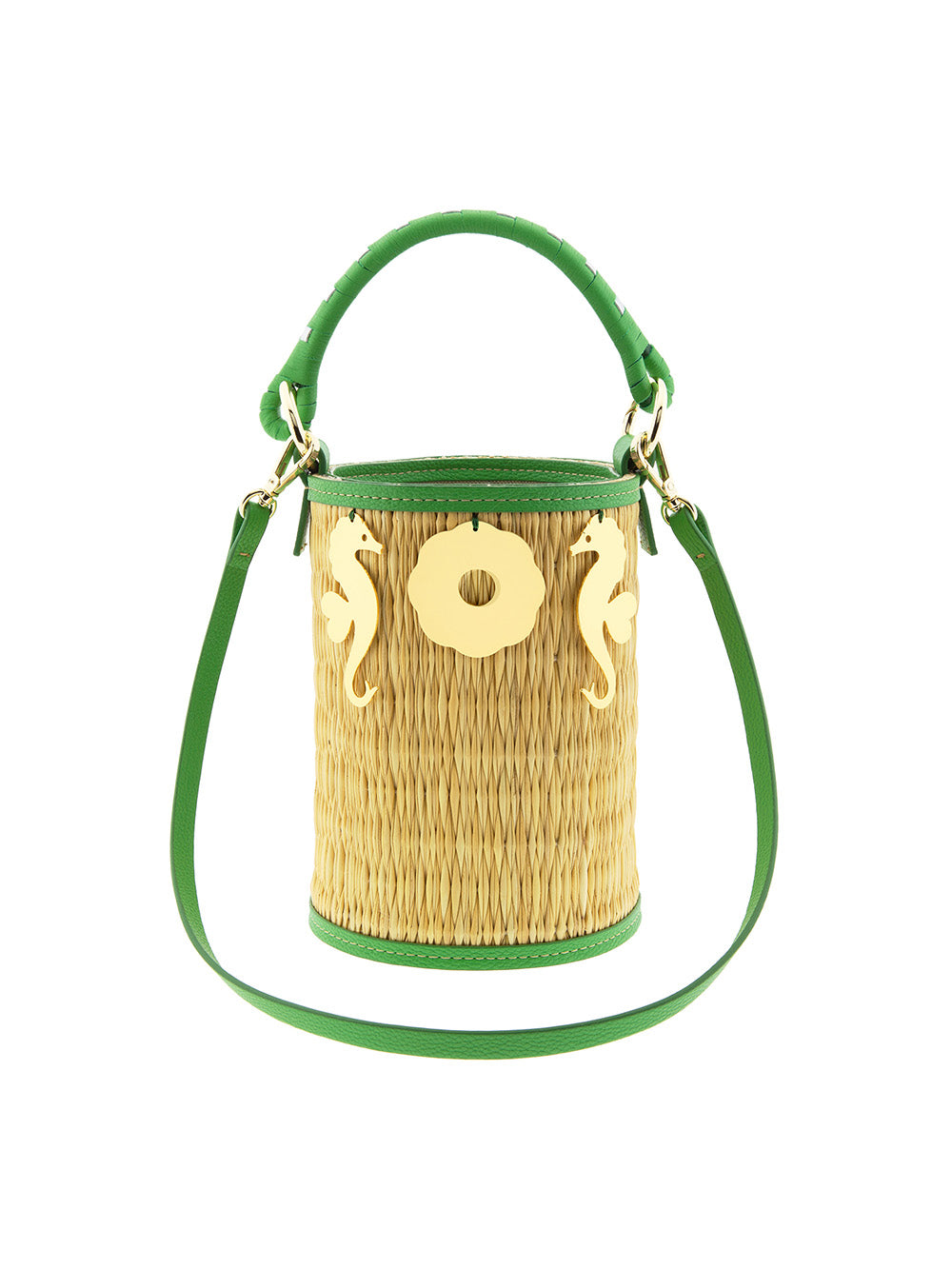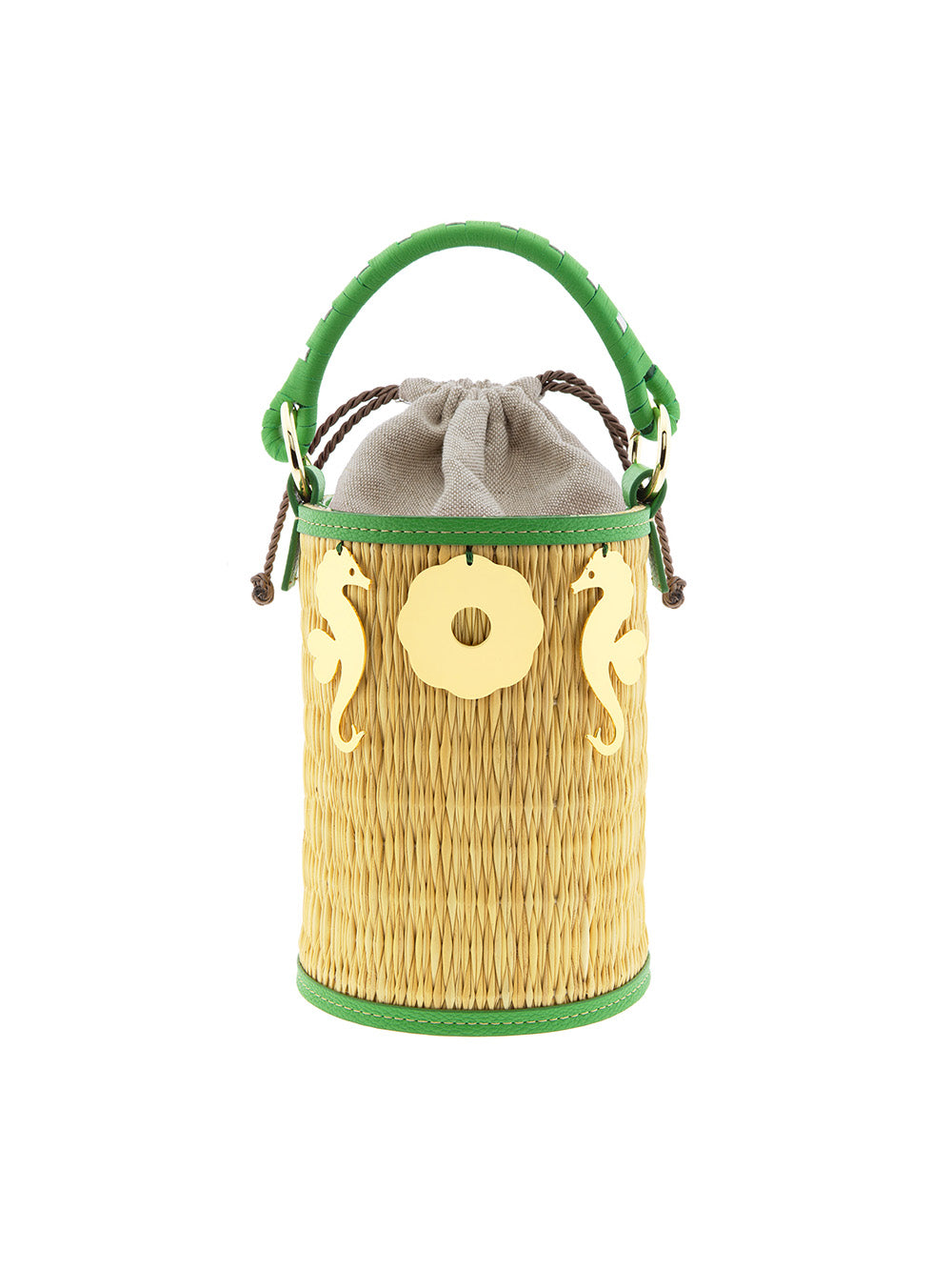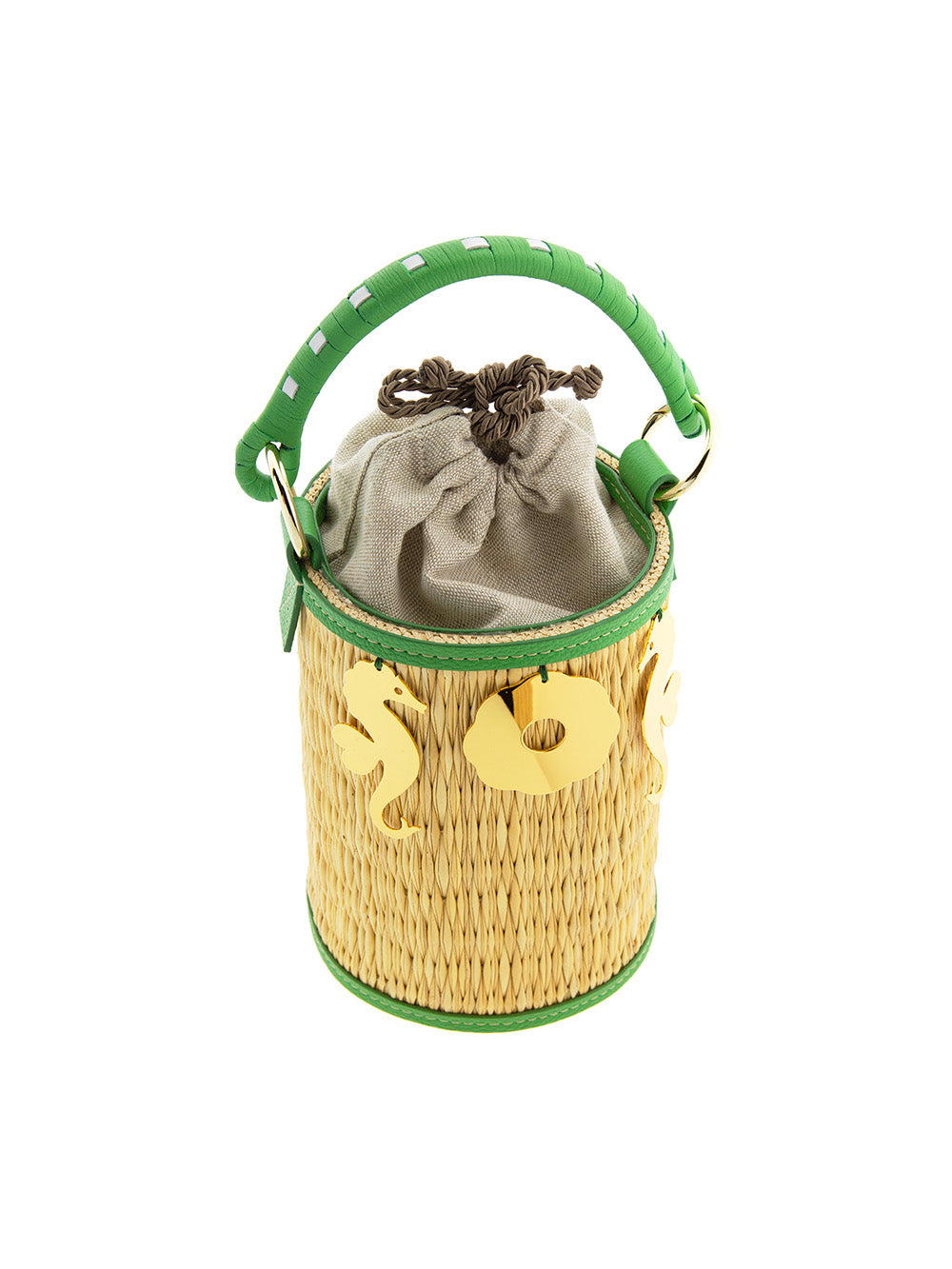 Cupid La Falaise bag signed Heimat Atlantianica, resulting from the collaboration with artist Flora Langlois. Hand-brained in Portugal by the Colareiras, women artisans with traditional know-how, it is made of natural reed and green calf leather. The bag is decorated with delicate gold metal charms evoking a onelike marine world suspended gracefully from a handle designed by the master craftsman Idoia Cuesta.