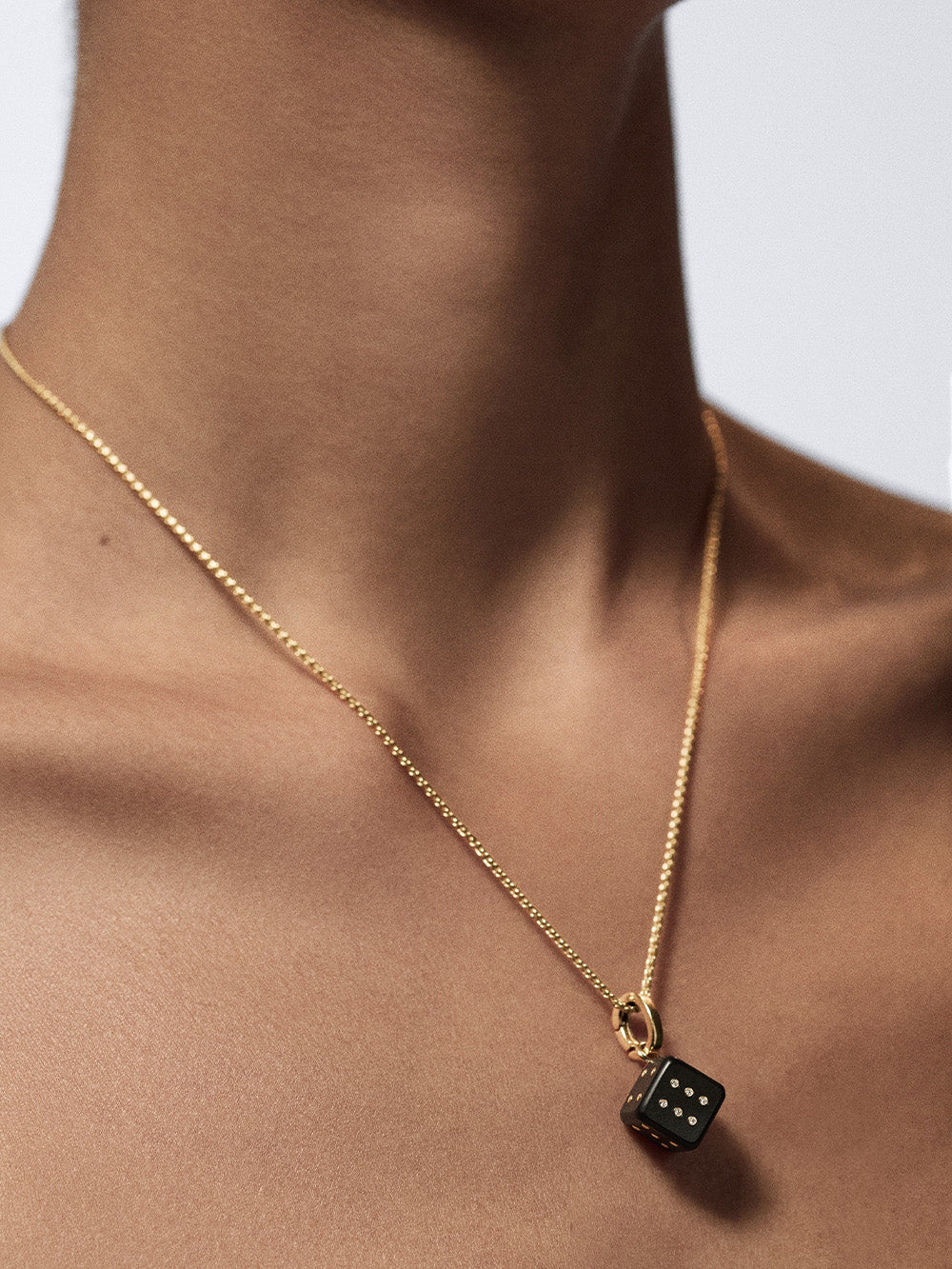The 11mm Dado Ebony pendant by Marie Lichtenberg is made of black ebony set with white diamonds, like a playing dice. Sold with a clasp and a hoop, it can be worn either as a pendant or as an earring.