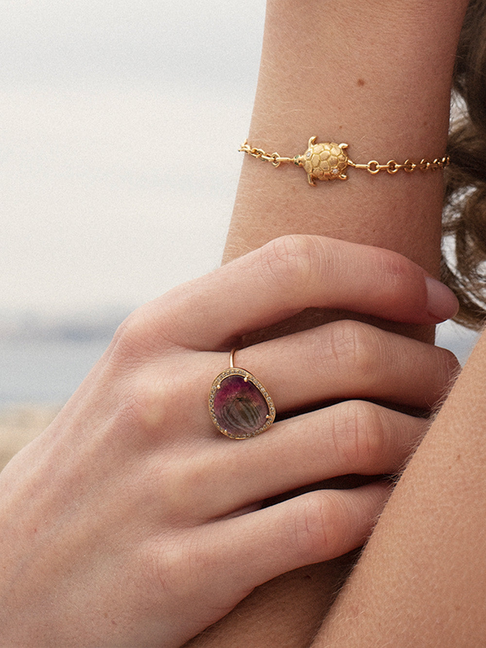 This Donatello bracelet by designer Salomé Rico is made from recycled 18-carat yellow gold. It is decorated with a small turtle set with diamonds and two tsavorites at eye level. This jewel is handmade in the brand's Parisian workshops.
