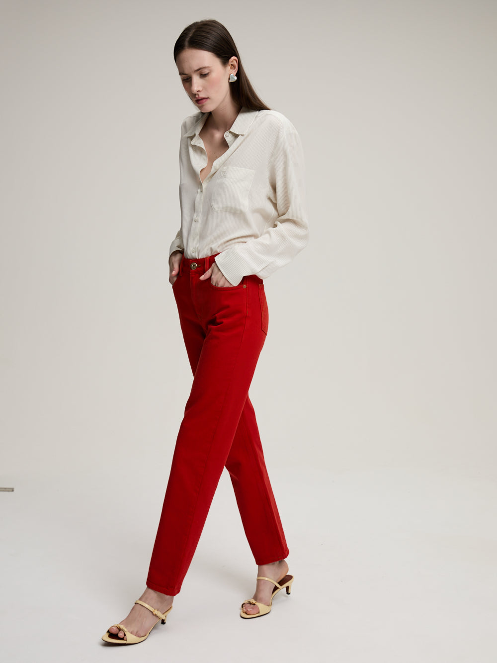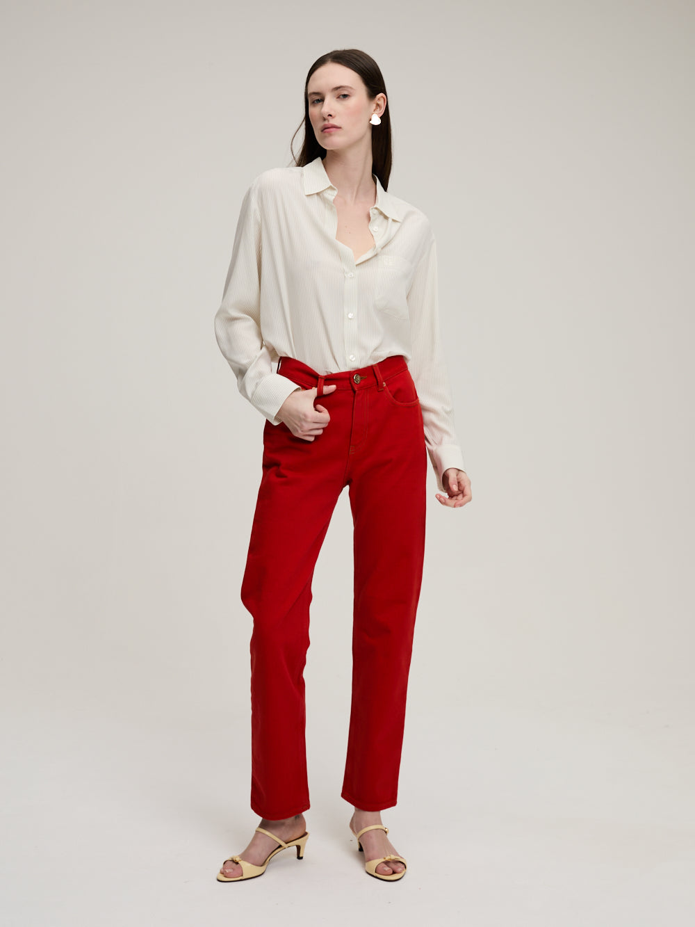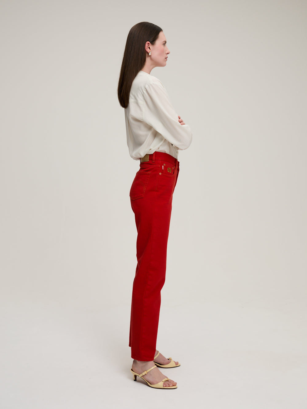 Jean Paso Clapotis by Blazé Milano, crafted from red denim. Straight-leg, high-waisted jeans. A wardrobe classic.