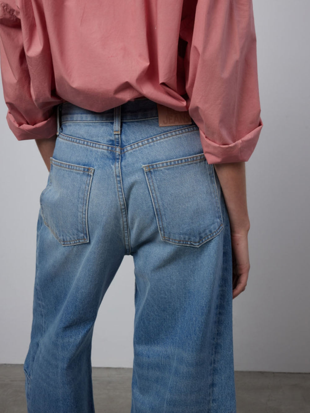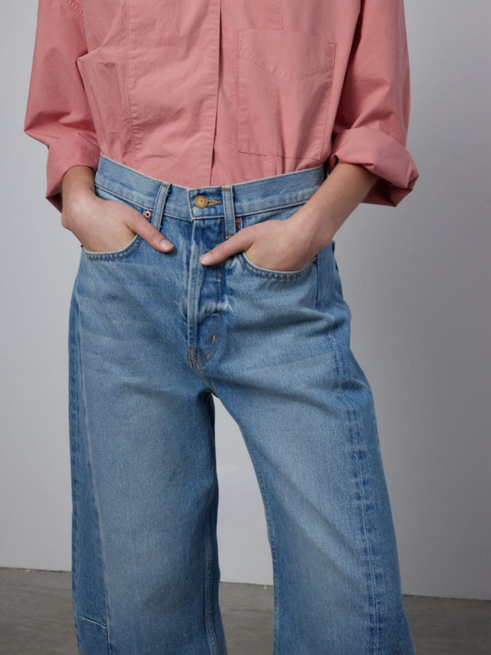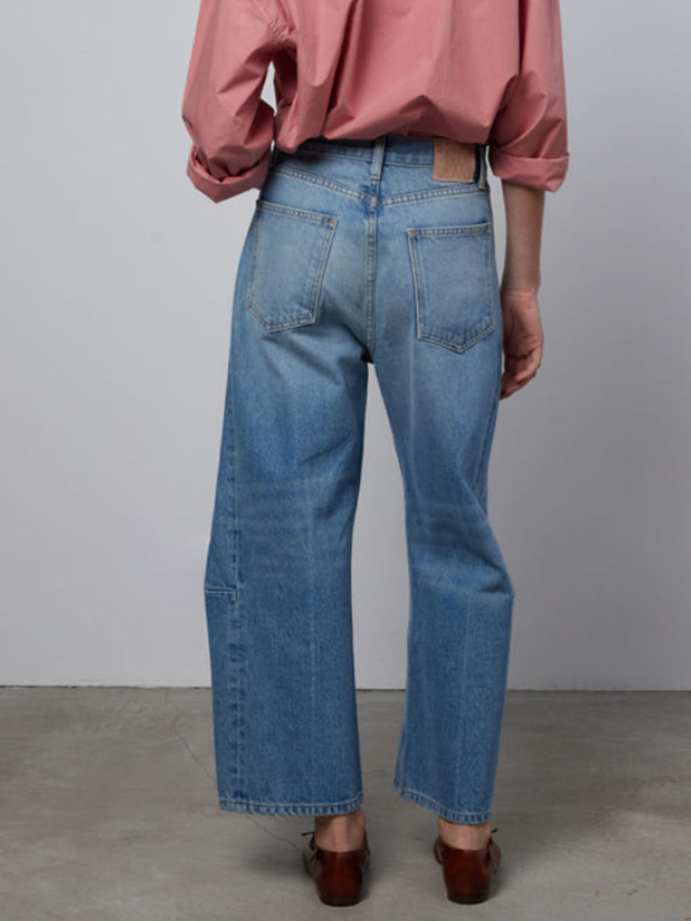 Lasso Bsides Jeans. These jeans are cut from a thick, sun-washed cotton denim. This piece has a mid-rise waist and wide legs that are slightly short with a hem on the bottom, ensuring a casual look.