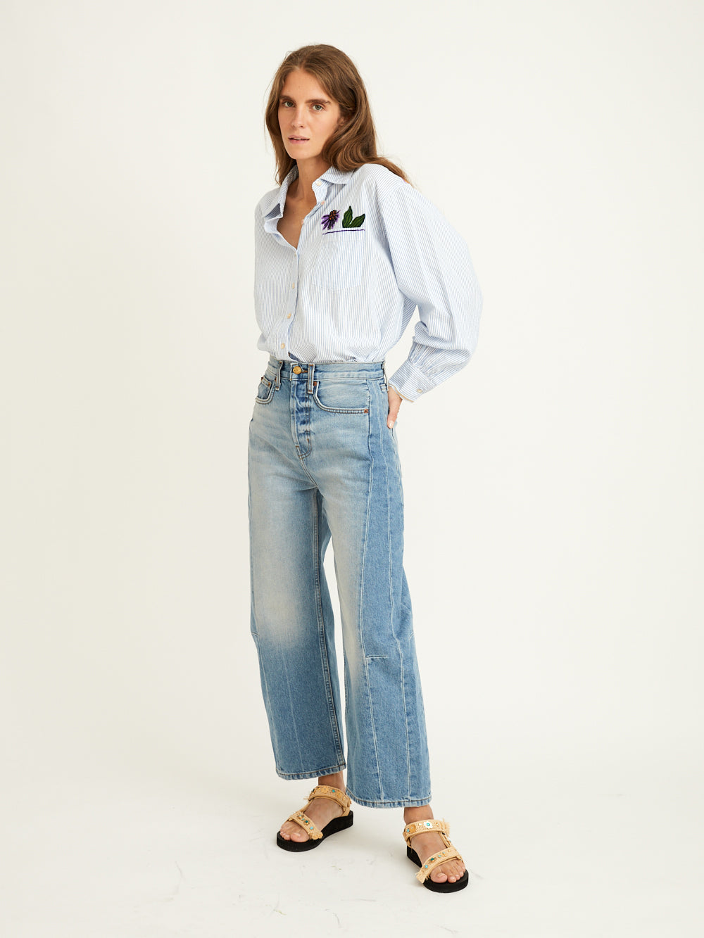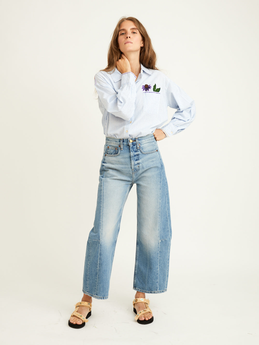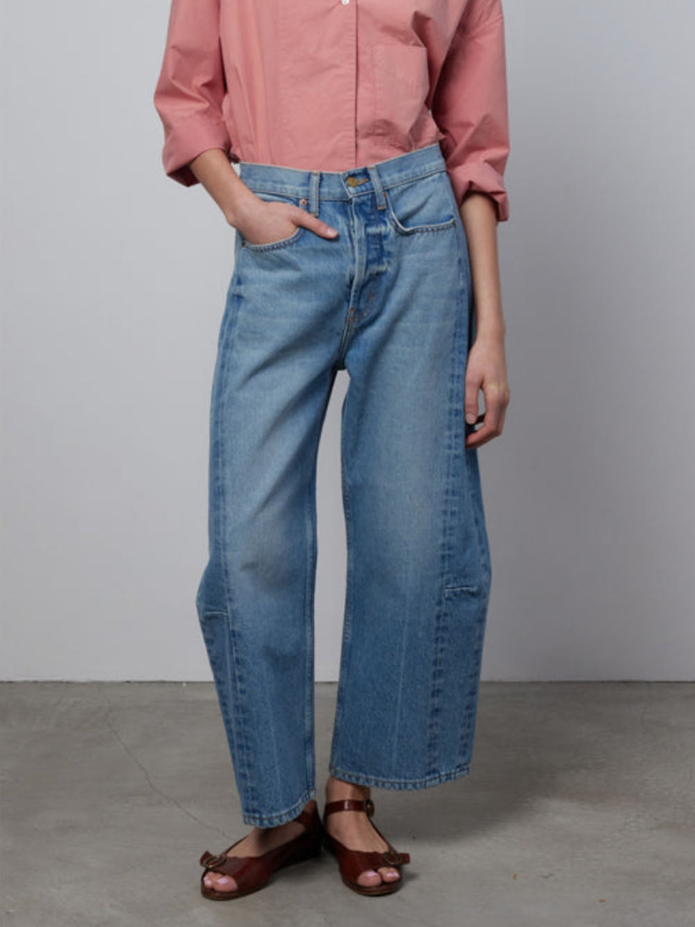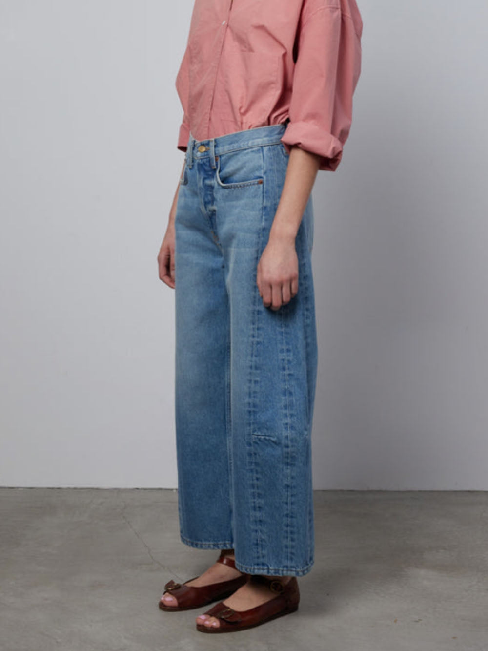 Lasso Bsides Jeans. These jeans are cut from a thick, sun-washed cotton denim. This piece has a mid-rise waist and wide legs that are slightly short with a hem on the bottom, ensuring a casual look.