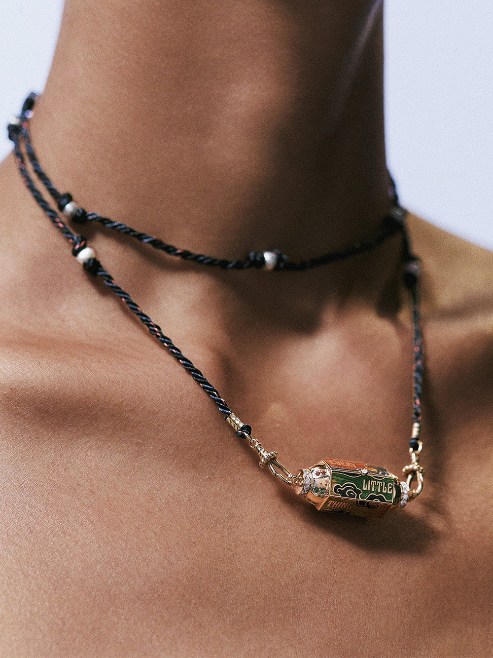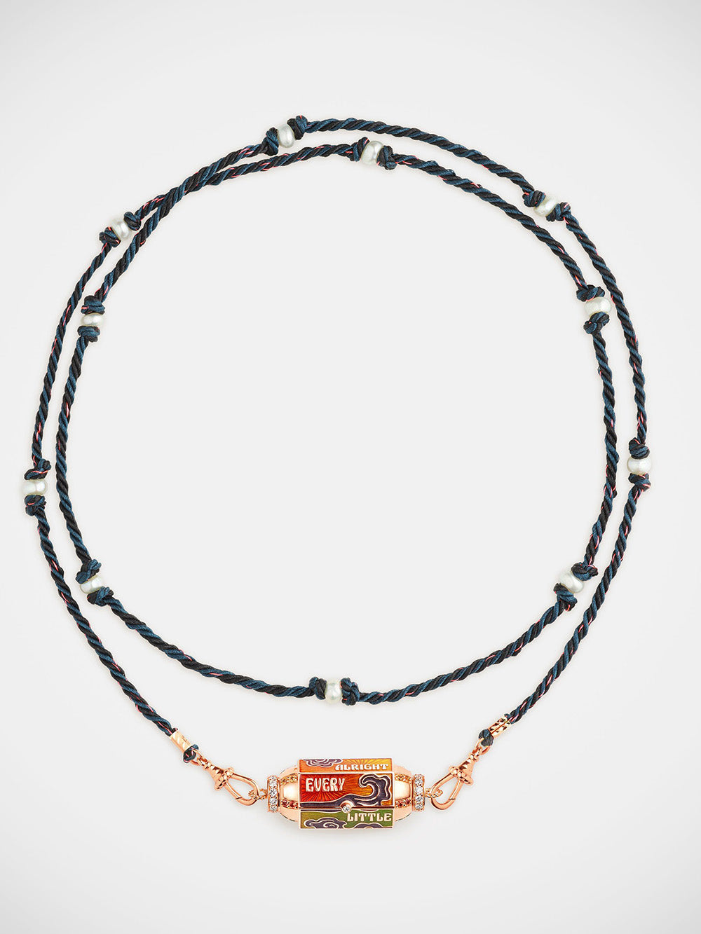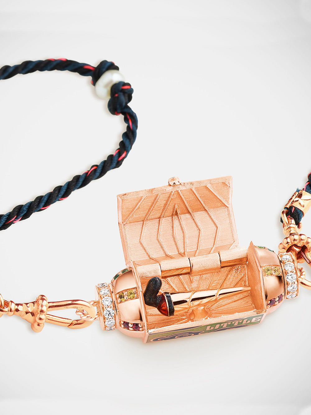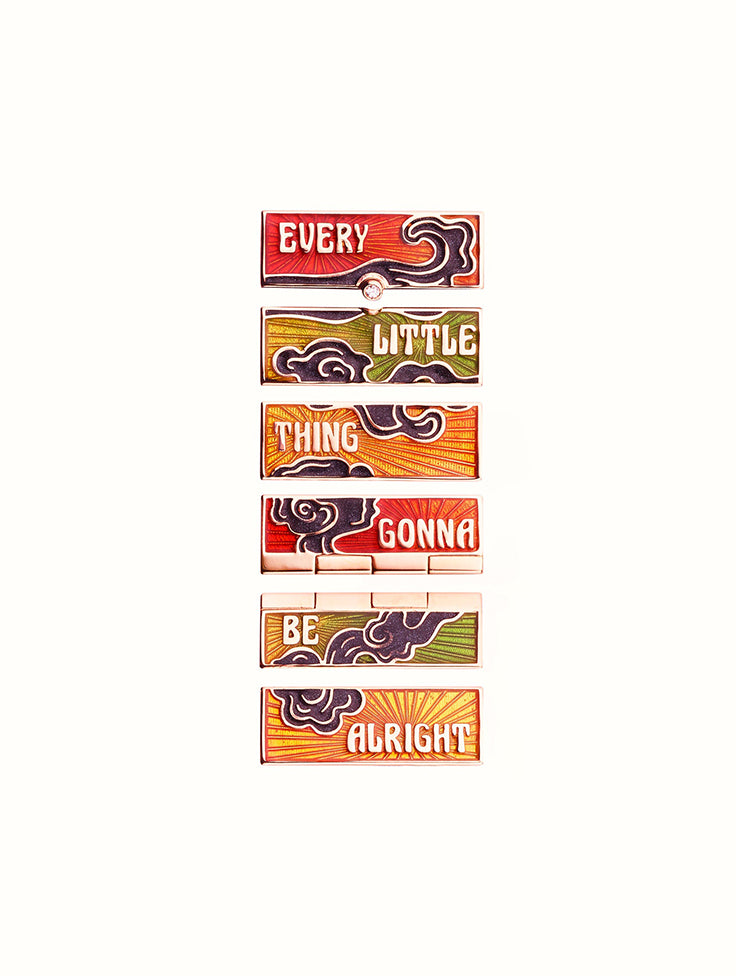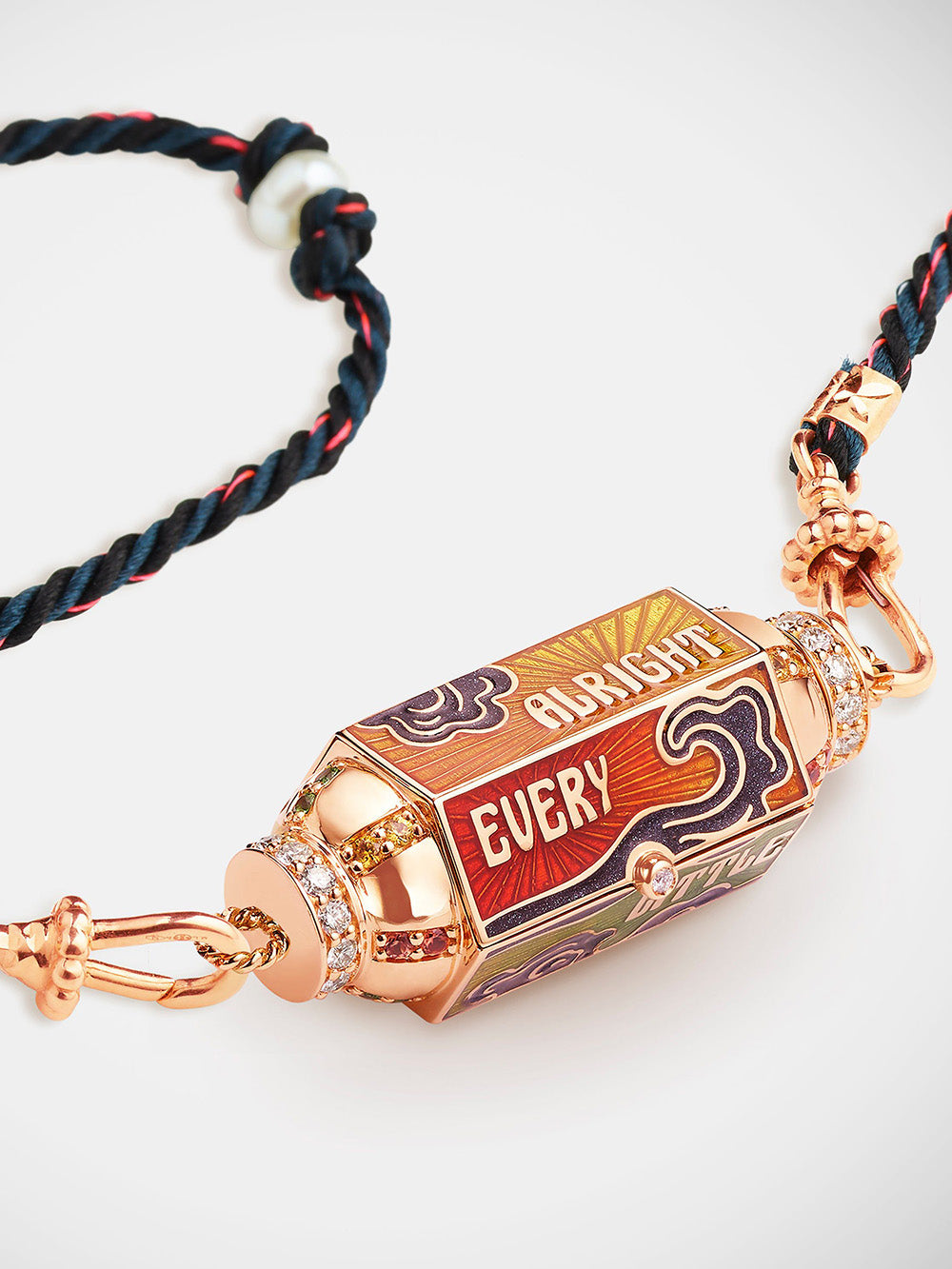 The locket blunt by Marie Lichtenberg is made of 18-carat rose gold. This necklace is composed of a locket pendant set with diamonds and multicolored sapphires on the sides. It is made in shades of yellow, orange and green has several facets on which are the inscriptions "every", "little", "thing", "gonna", "be", "alright" and a diamond. This necklace is sold on a 73cm rathi link that can be worn in double wrap.