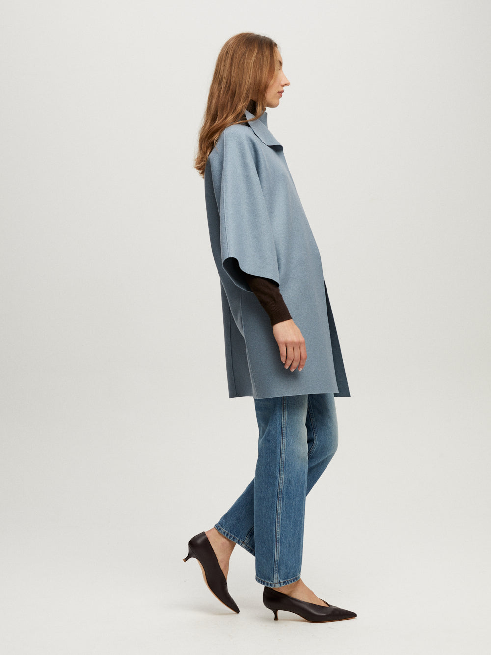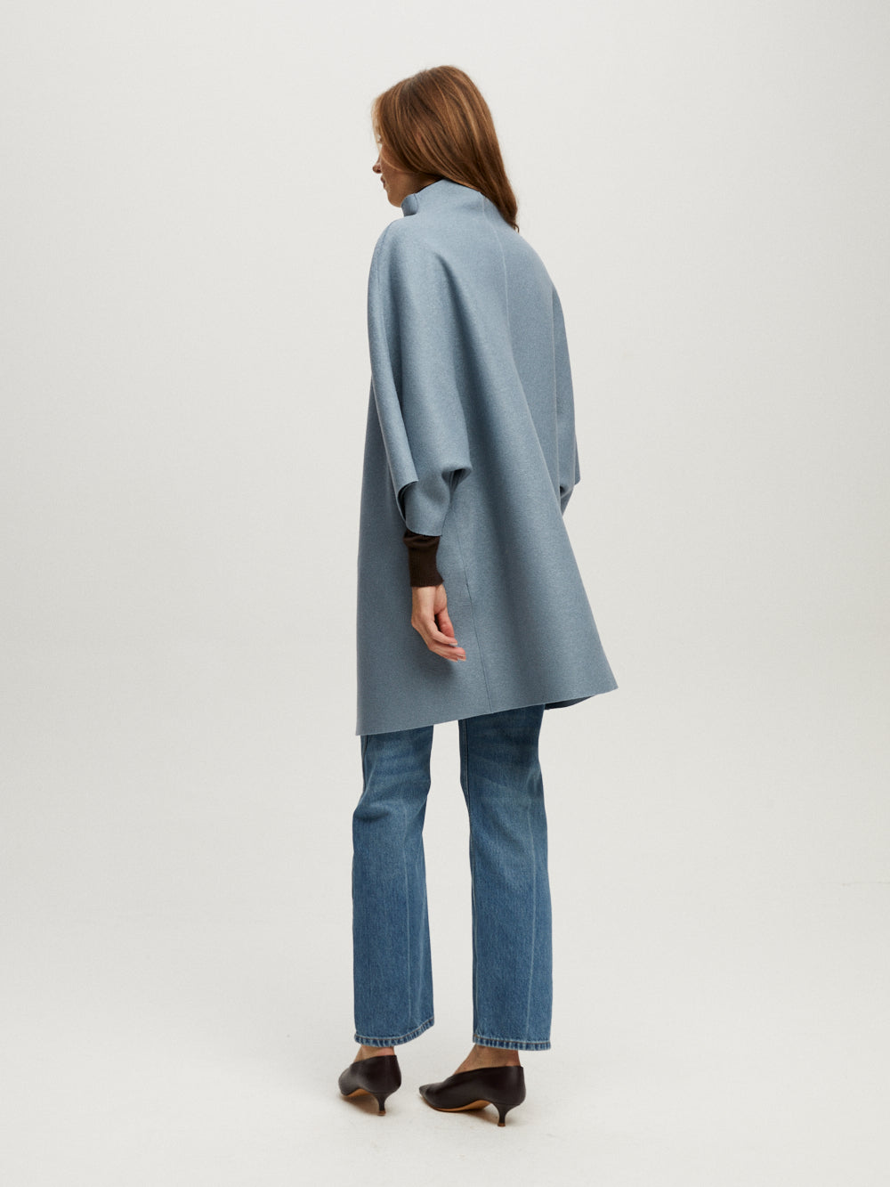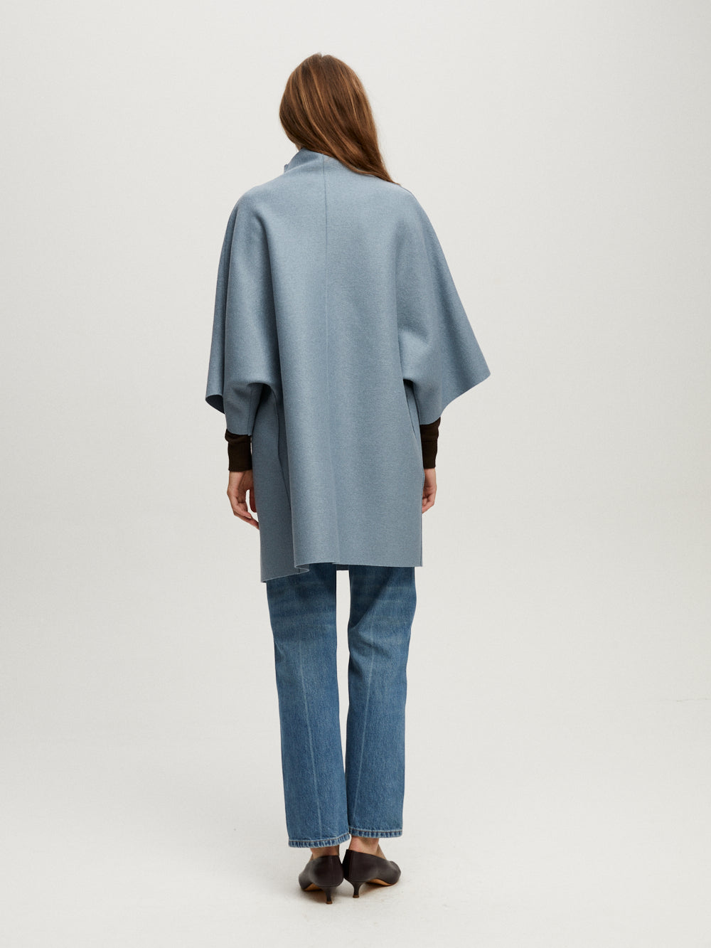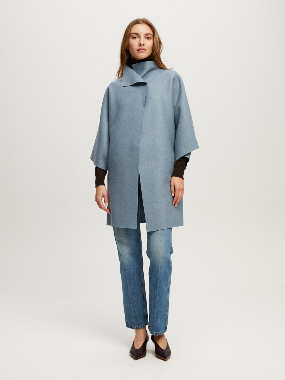 Kimono coat by Harris Wharf London crafted from blue-grey felted wool. A short coat with three-quarter-length sleeves, the coat fastens with a snap button at the collar.
