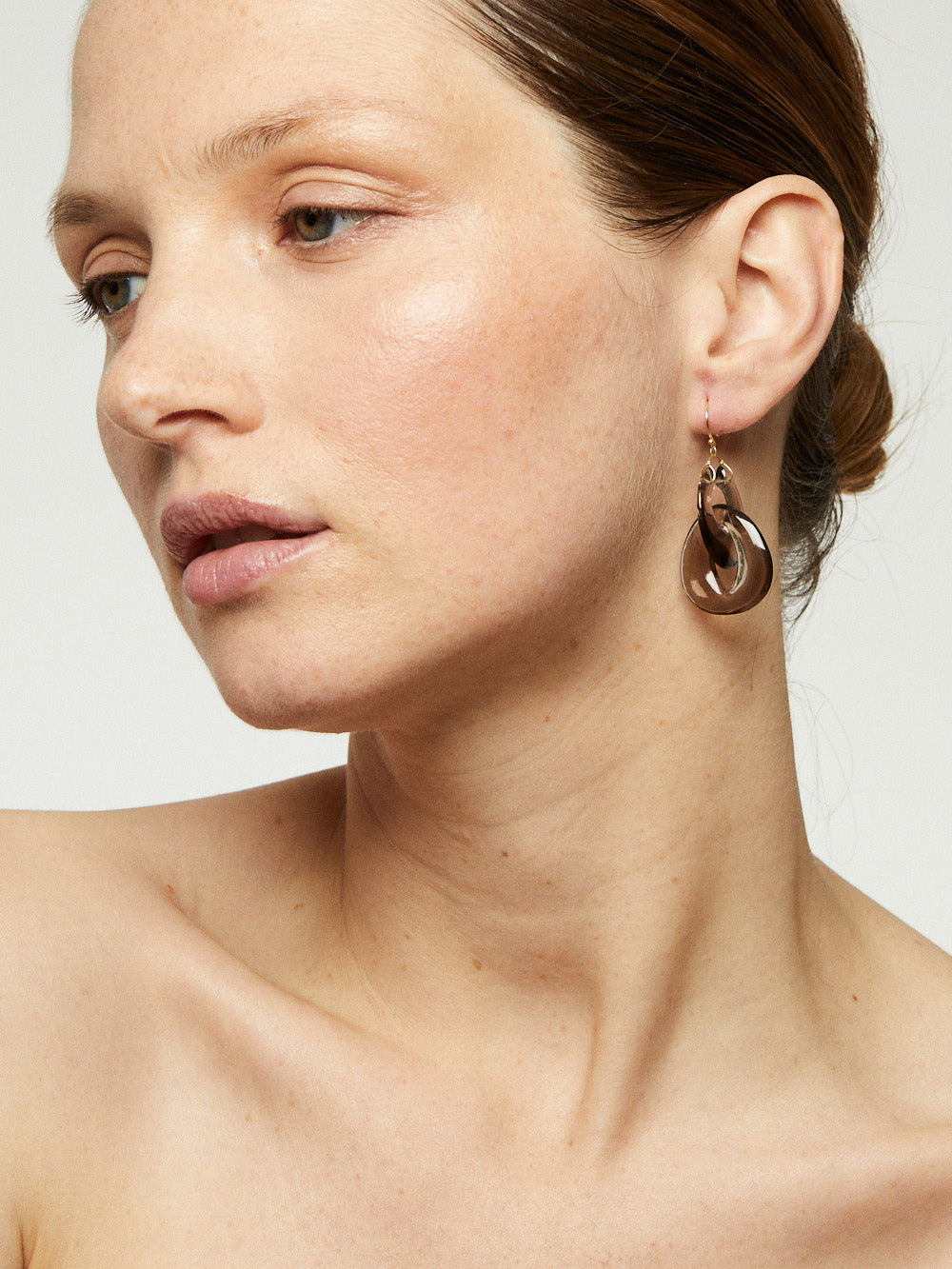 These Peacock Eye earrings from TenThousandThings are made from smoky quartz with a brown hue. They consist of two intertwined parrot eye-shaped rings.