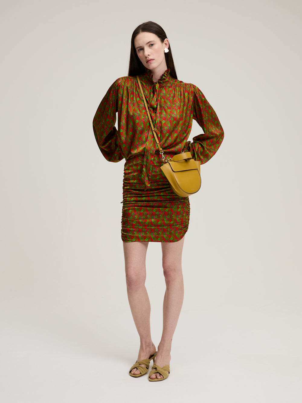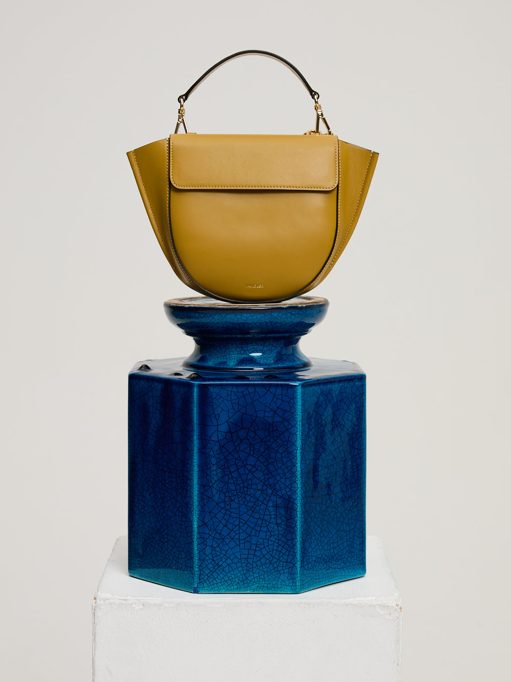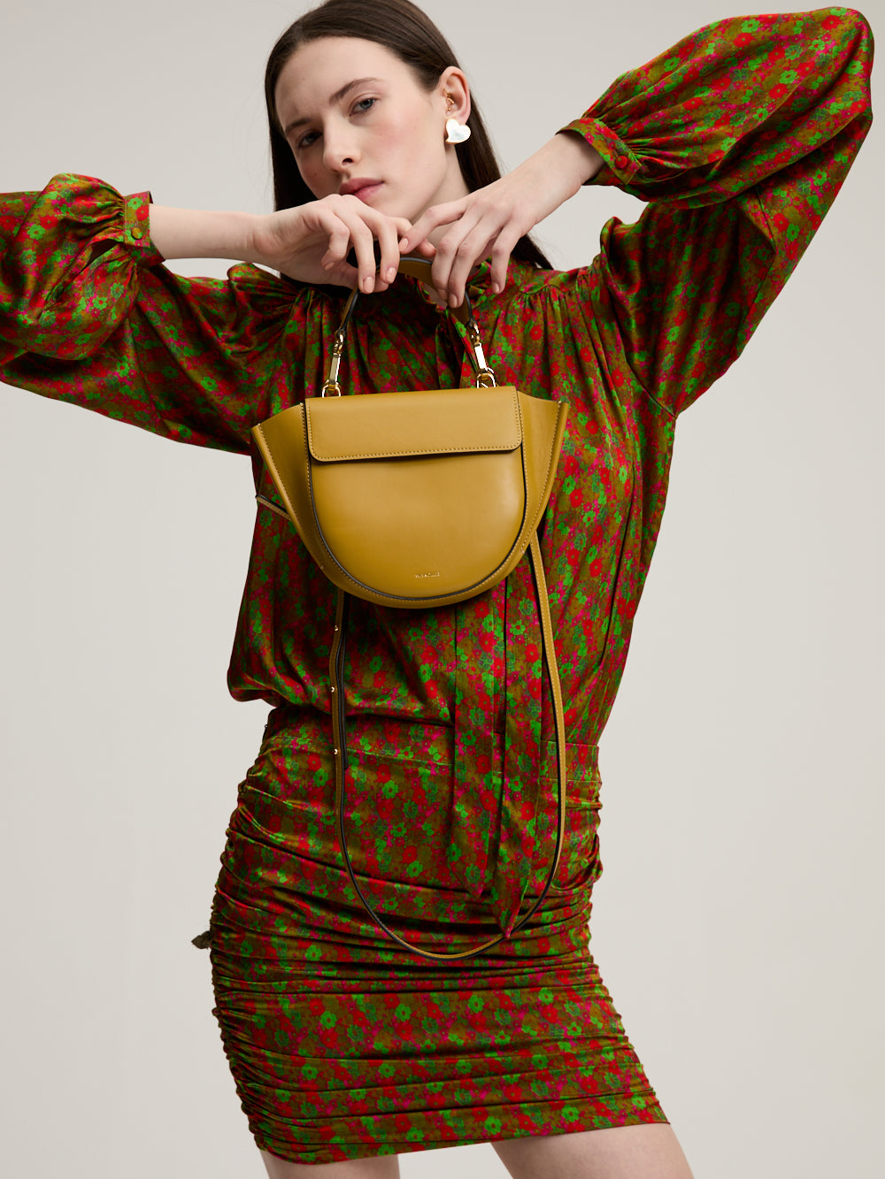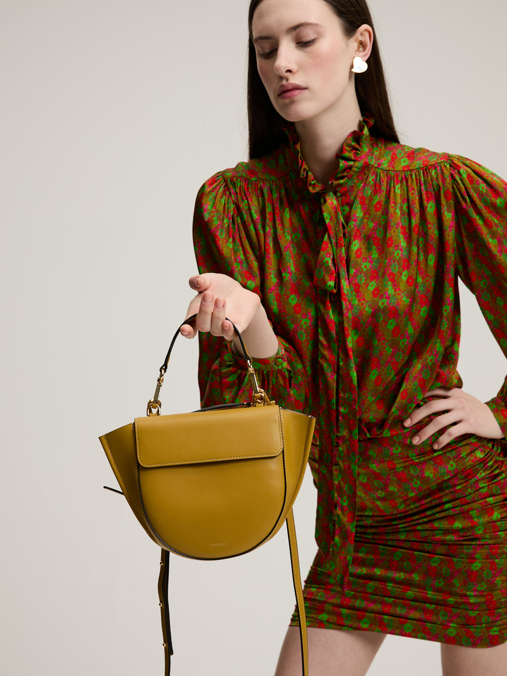 The Hortensia Mini Saffron bag by Wandler is crafted from saffron yellow leather. This circular bag can be carried by hand or over the shoulder thanks to a detachable strap.