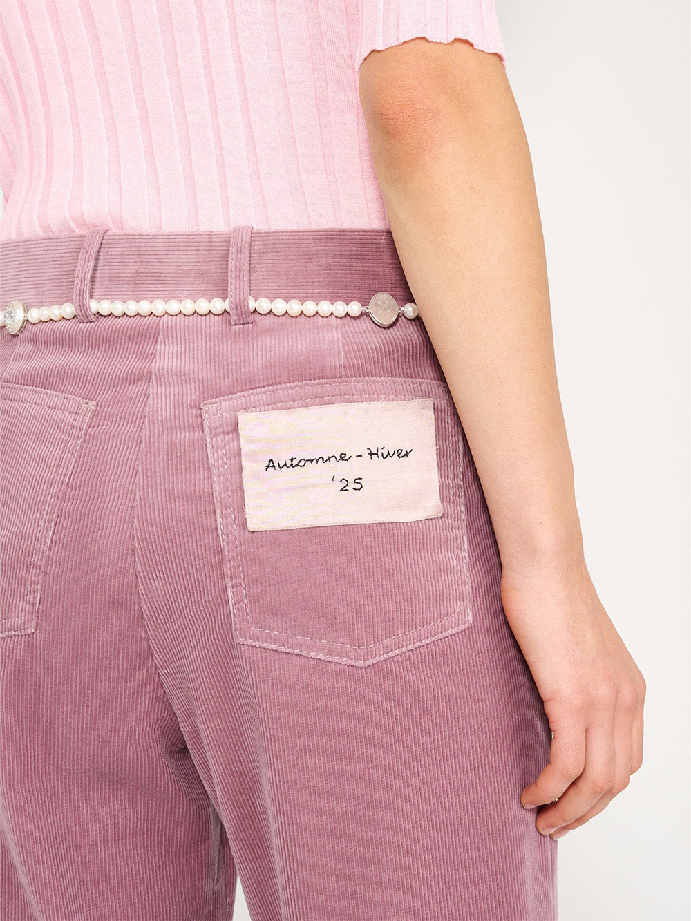 Downton trousers by Nackiyé, made from lilac corduroy. Straight-leg trousers with a pinched front detail.