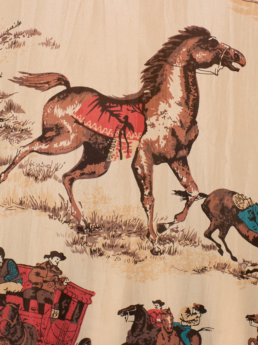 Dana Canyon Cowboy Shirt crafted from beige silk with a horse print. A lightweight, loose-fitting button-front shirt.