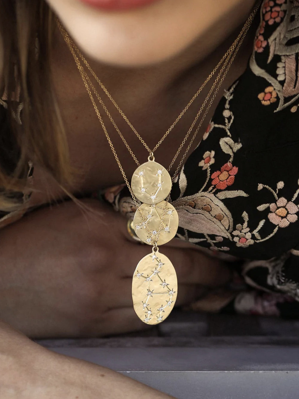 This 14k brushed gold astrology necklace from Brooke Gregson features five diamonds encrusted on a round gold pendant, forming a constellation pattern.