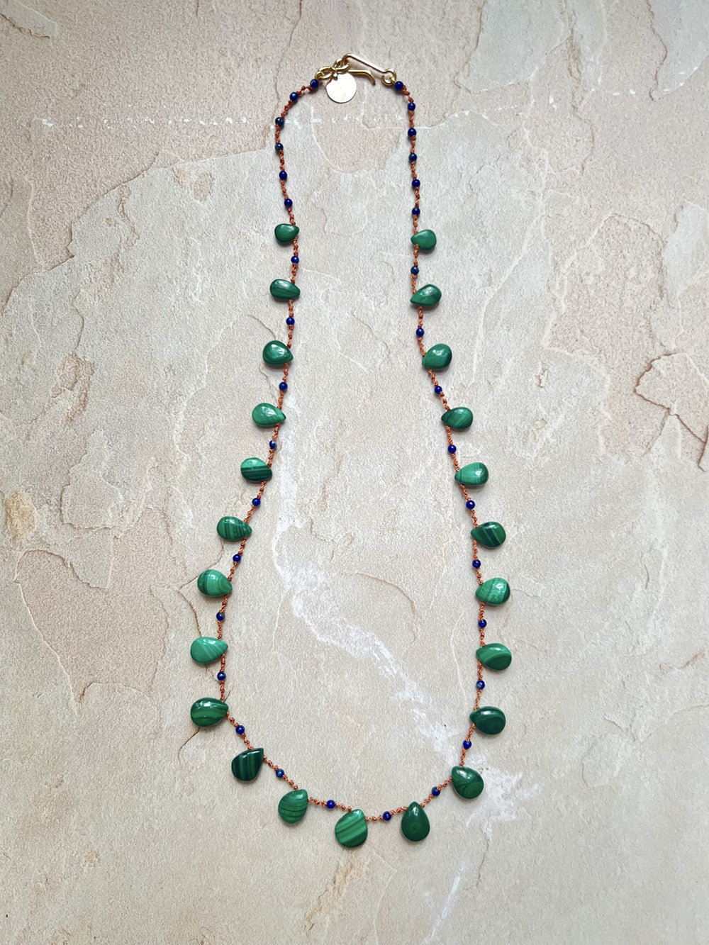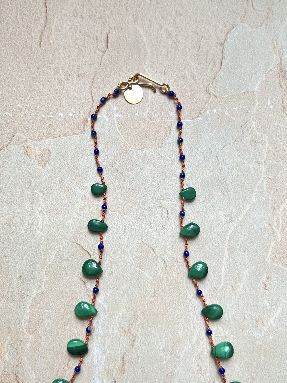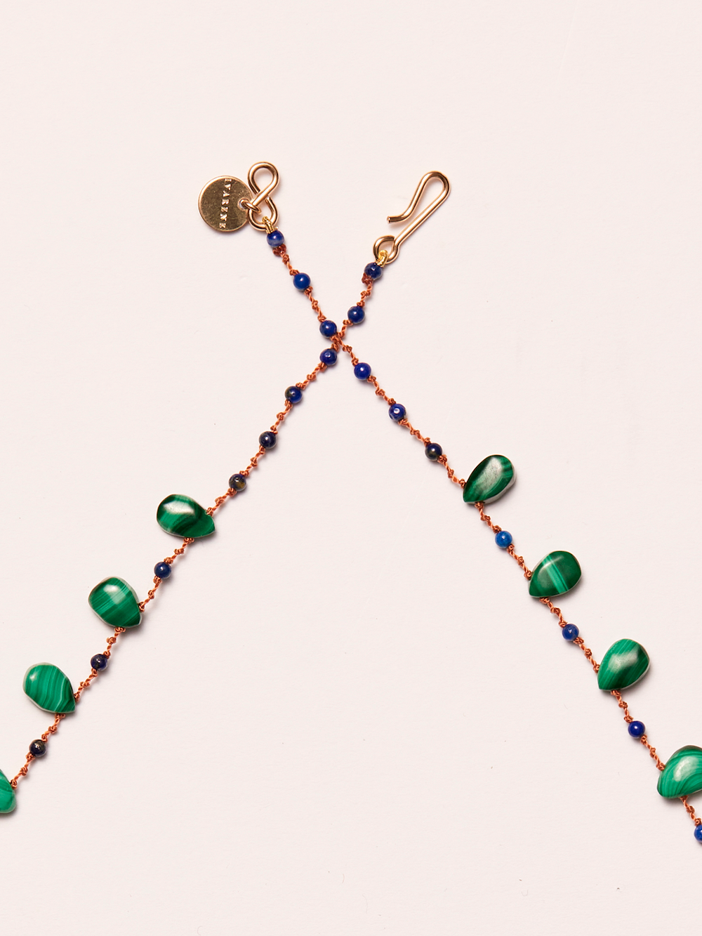 Bonview Malachite and Lapis Lazuli Ivarene Necklace. Each piece is unique and handmade in Paris. Malachite allows you to initiate transformations, it promotes change and risk taking. In everyday life, wearing the Malachite stone harmonizes your relationships with others.