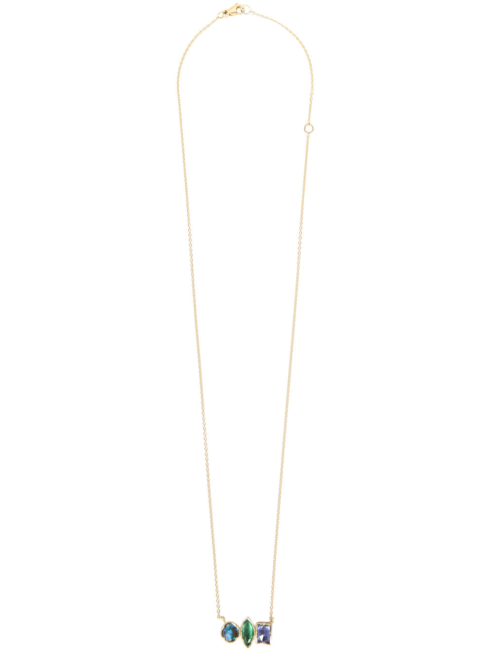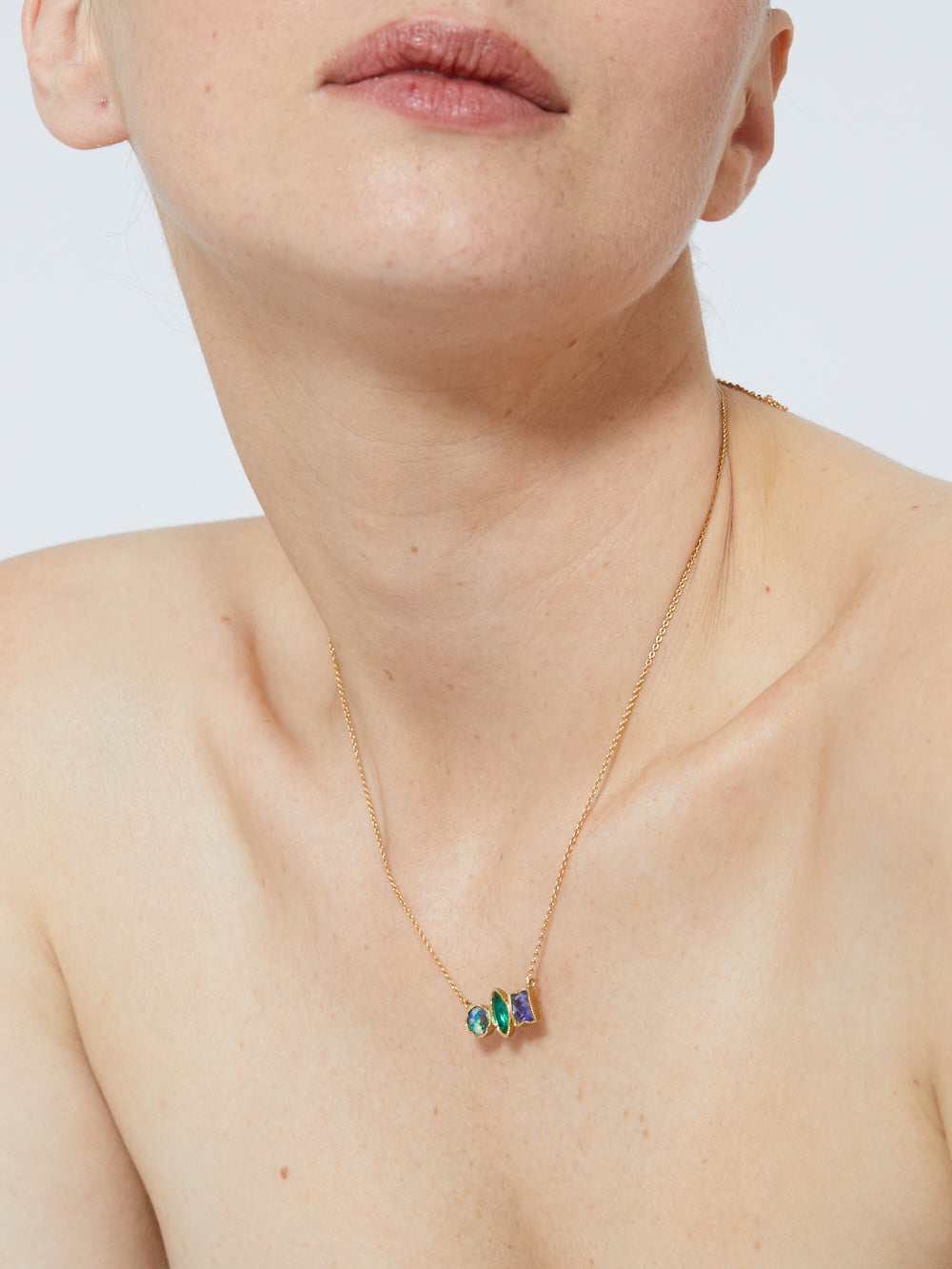 Necklace ornated by three crimped stones designed by Brooke Gregson. This necklace in yellow gold 18K is composed of an opale, an emerald and one tanzanite, all crimped with different geometric shapes.