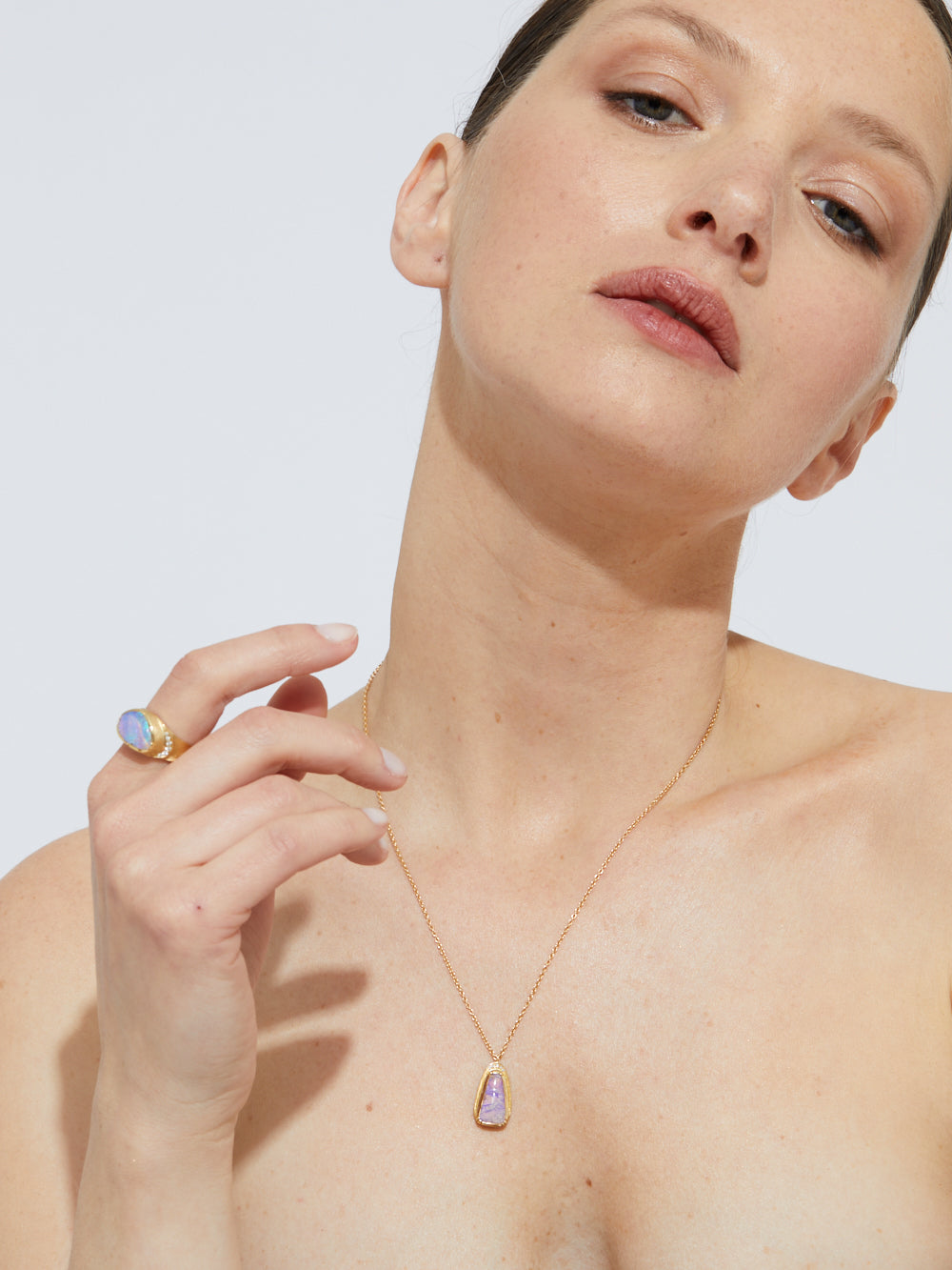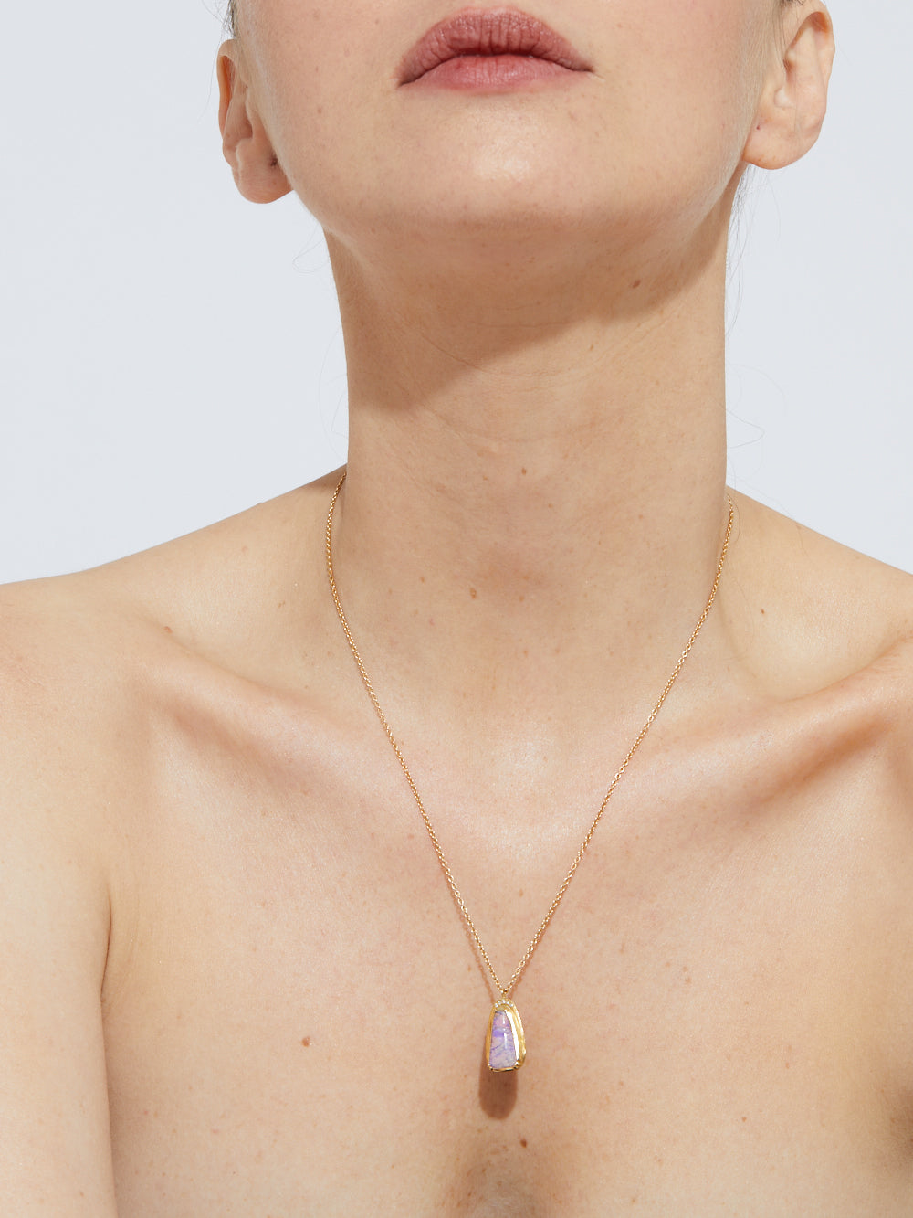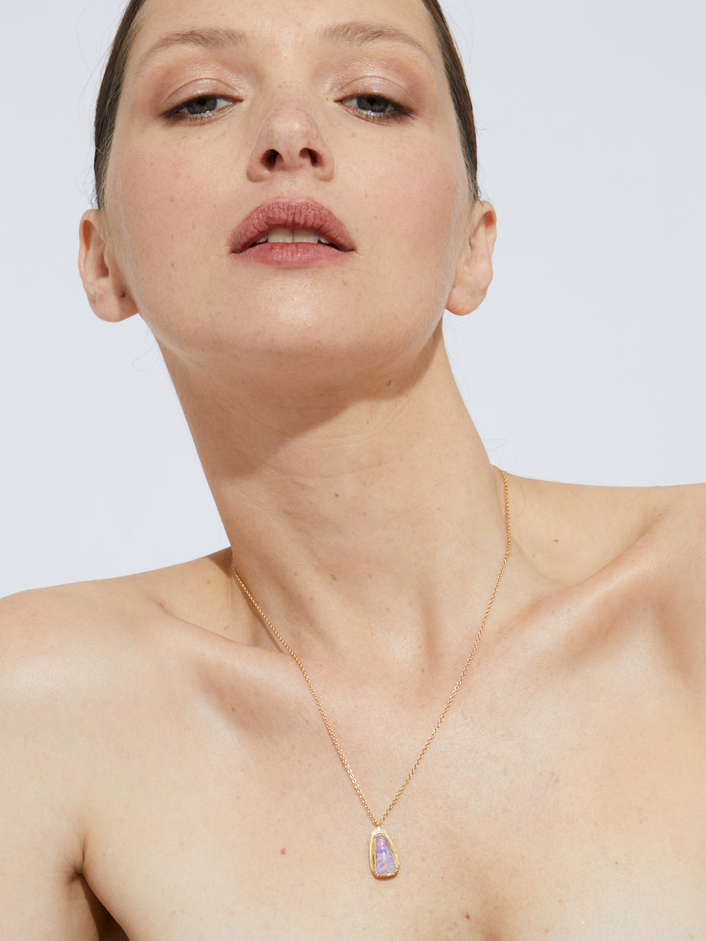 Brooke Gregson Goutte necklace made of wood opal with purple and 18 carat yellow gold reflections set with diamonds. A jewel made by hand by the artisans of the brand in London.