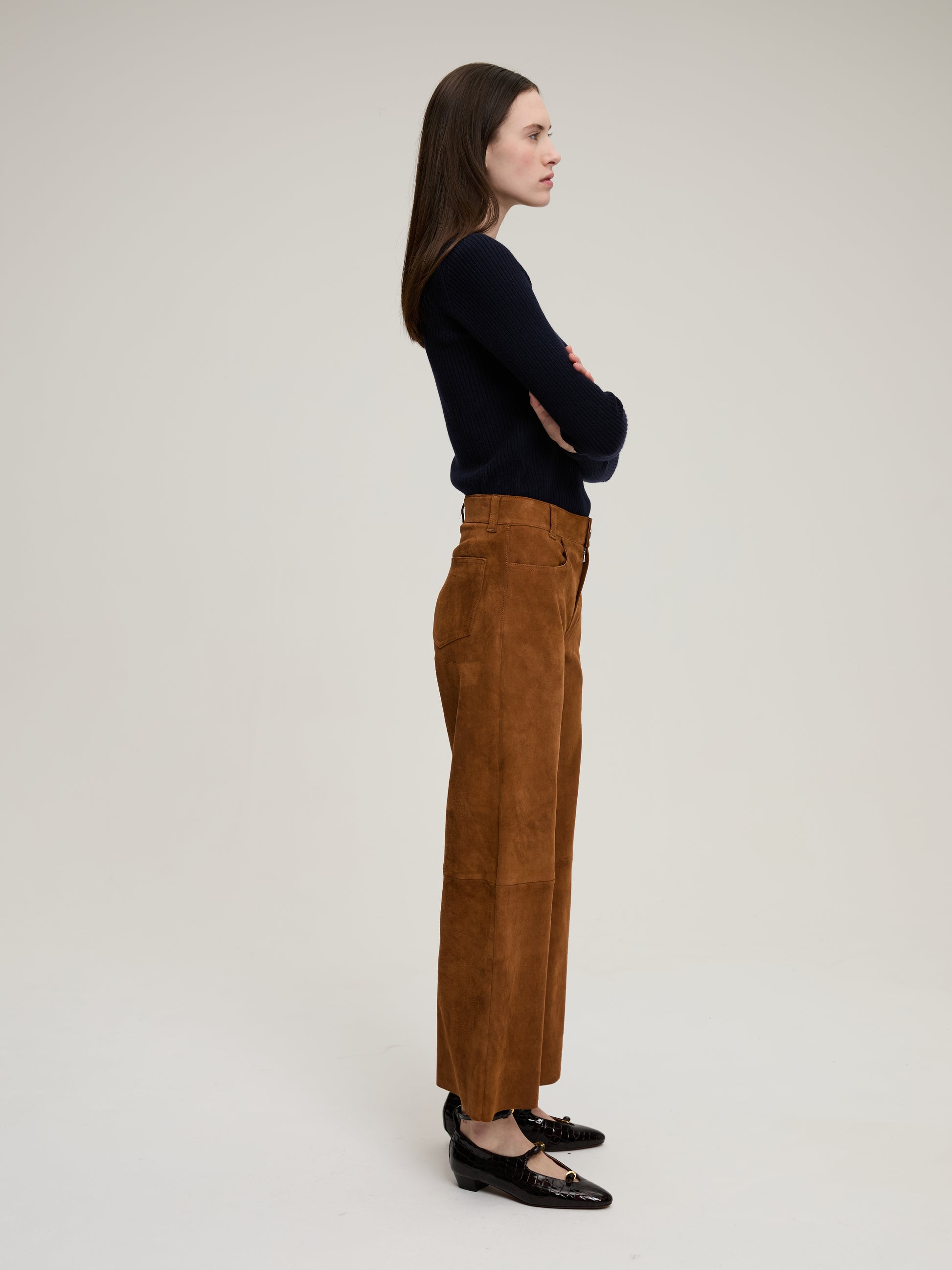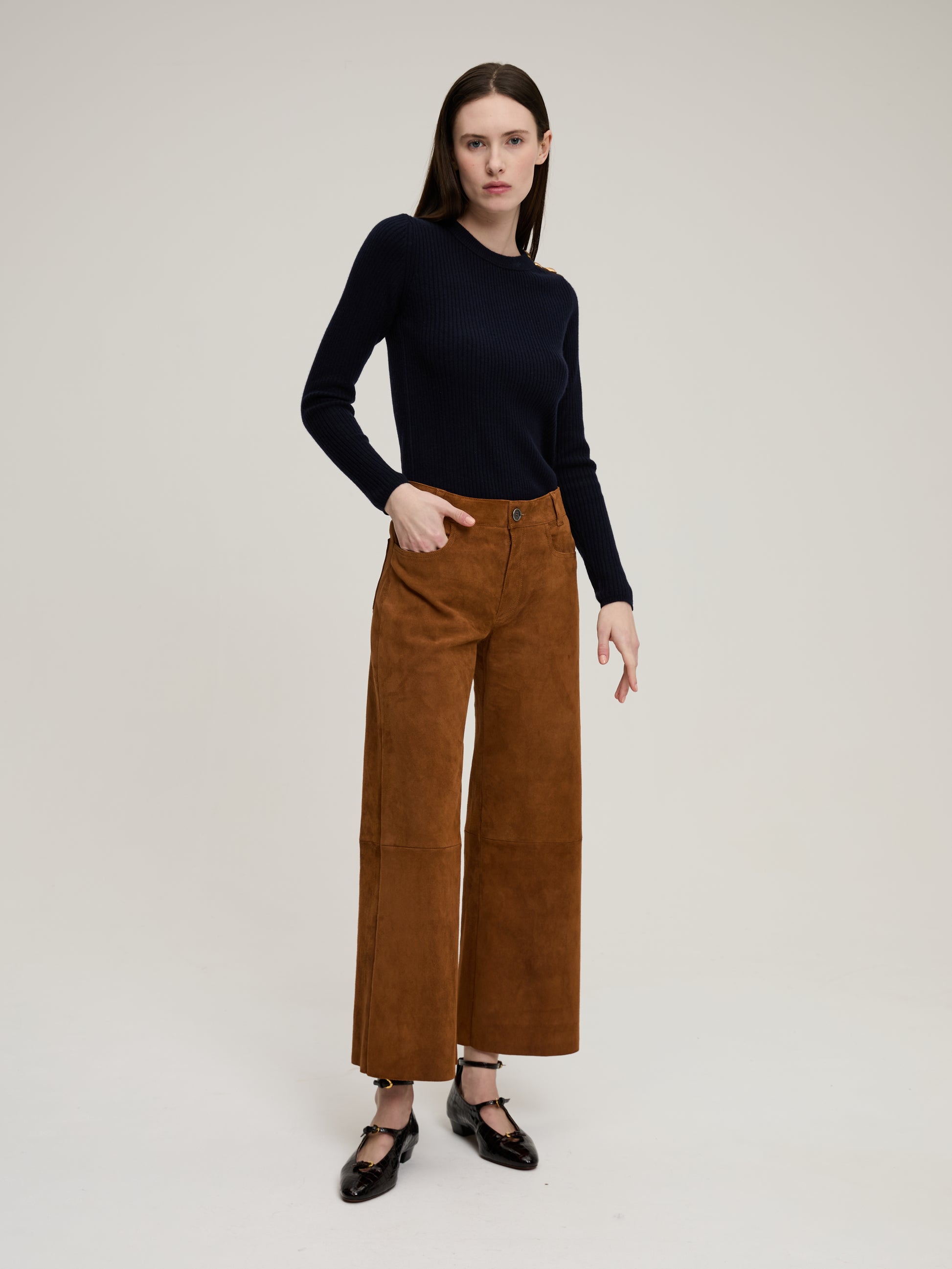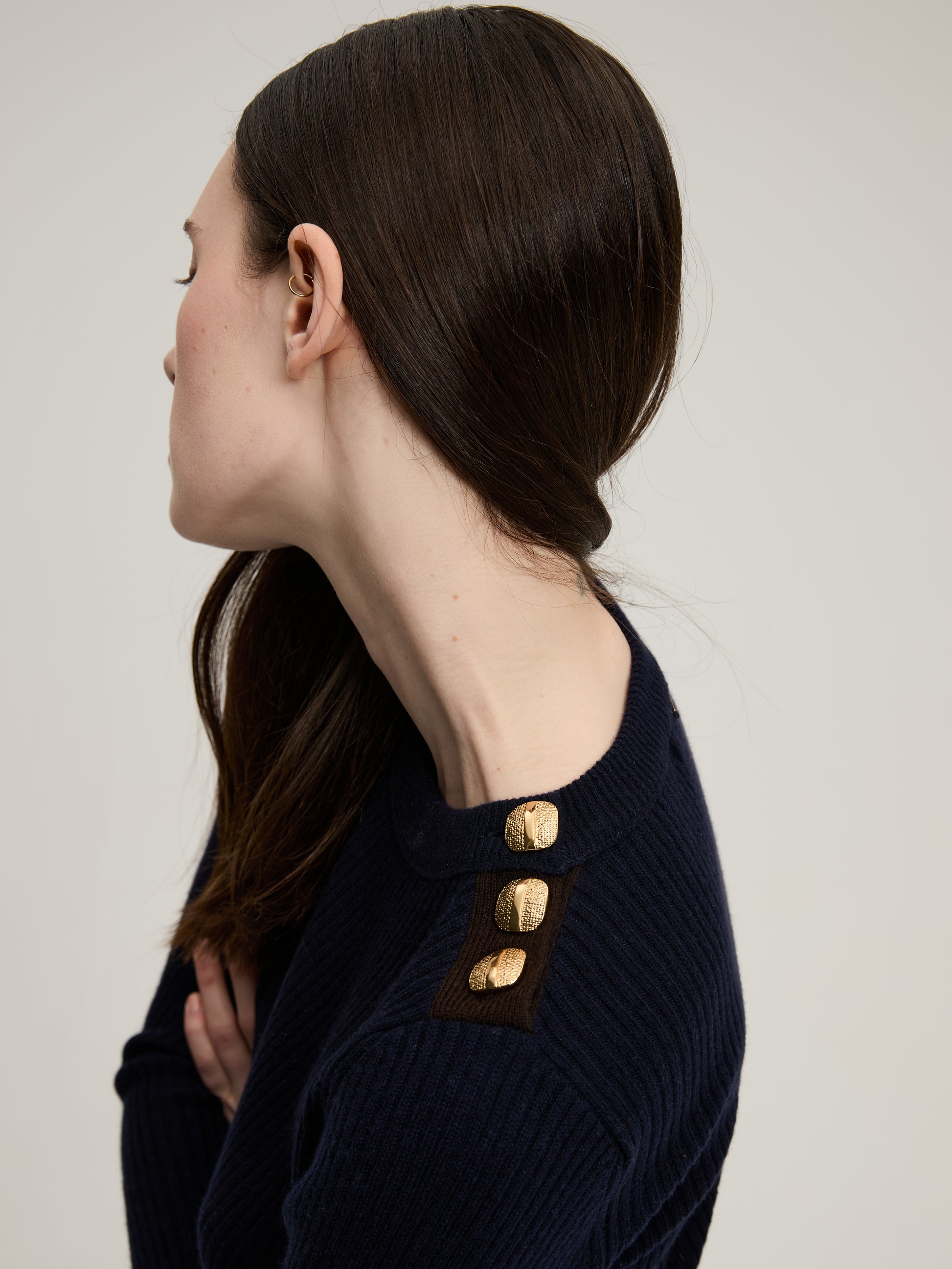 Théodore sweater by BY Marie Collection made of navy blue cashmere. A close-fitting sweater in ribbed knit with a contrasting brown button placket. Textured buttons in fine gold.