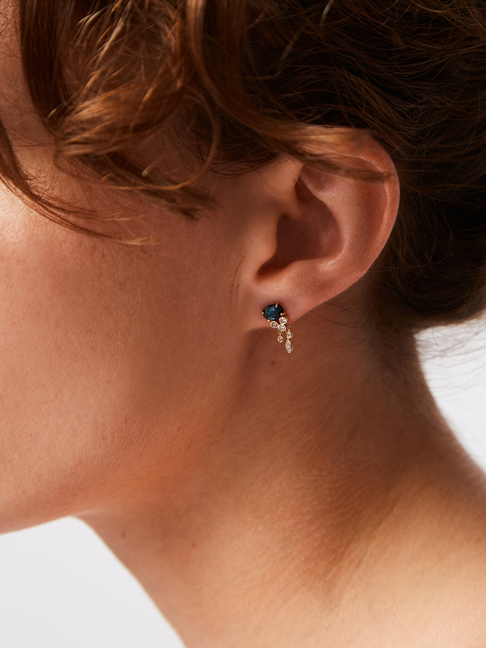 This Jelly earring by Céline Daoust is made of 14-carat yellow gold, tourmaline and diamonds. Each gemstone has been hand-selected by Céline Daoust during her travels abroad. Tourmaline is in gradient shades of navy blue and green.