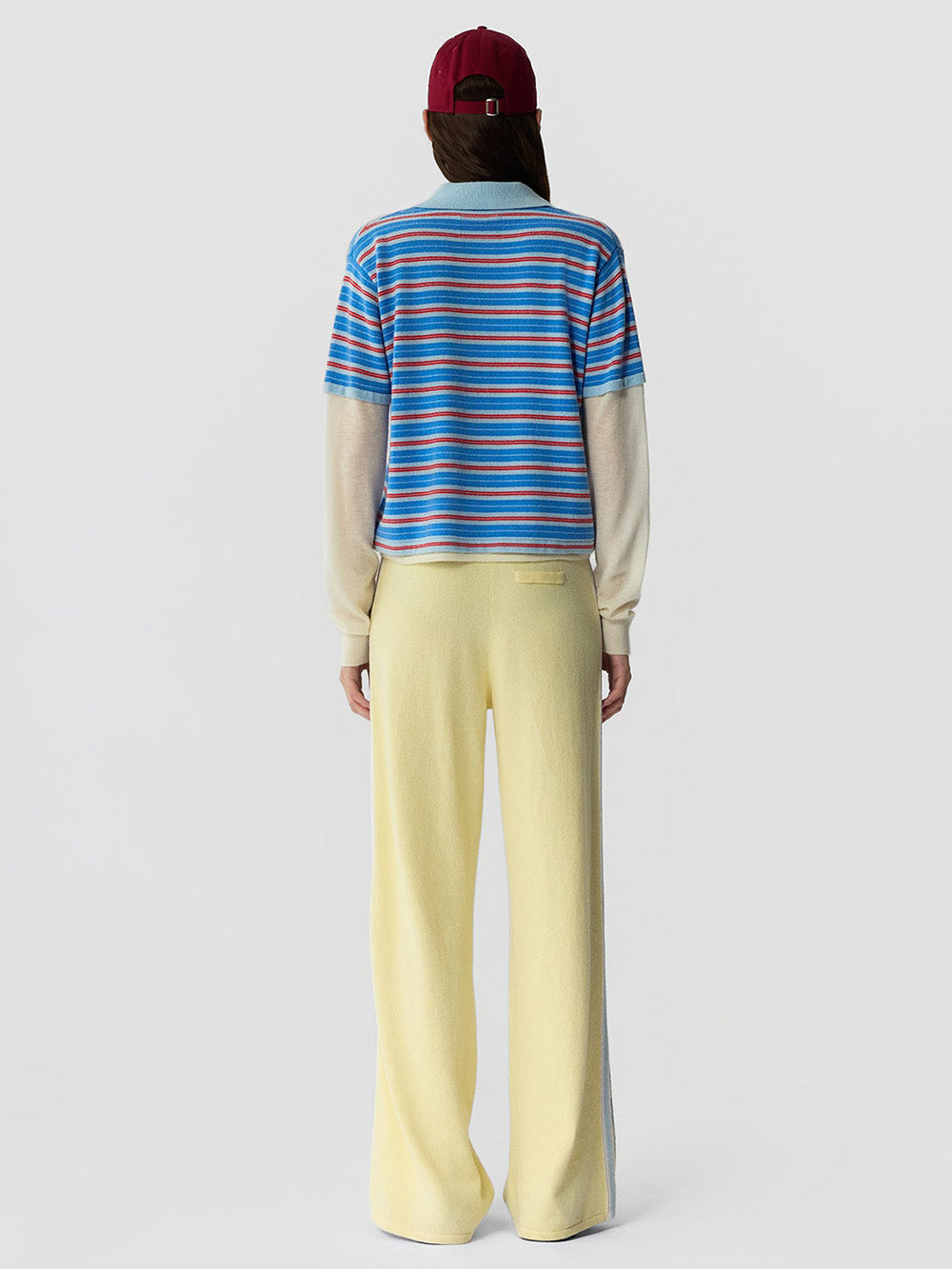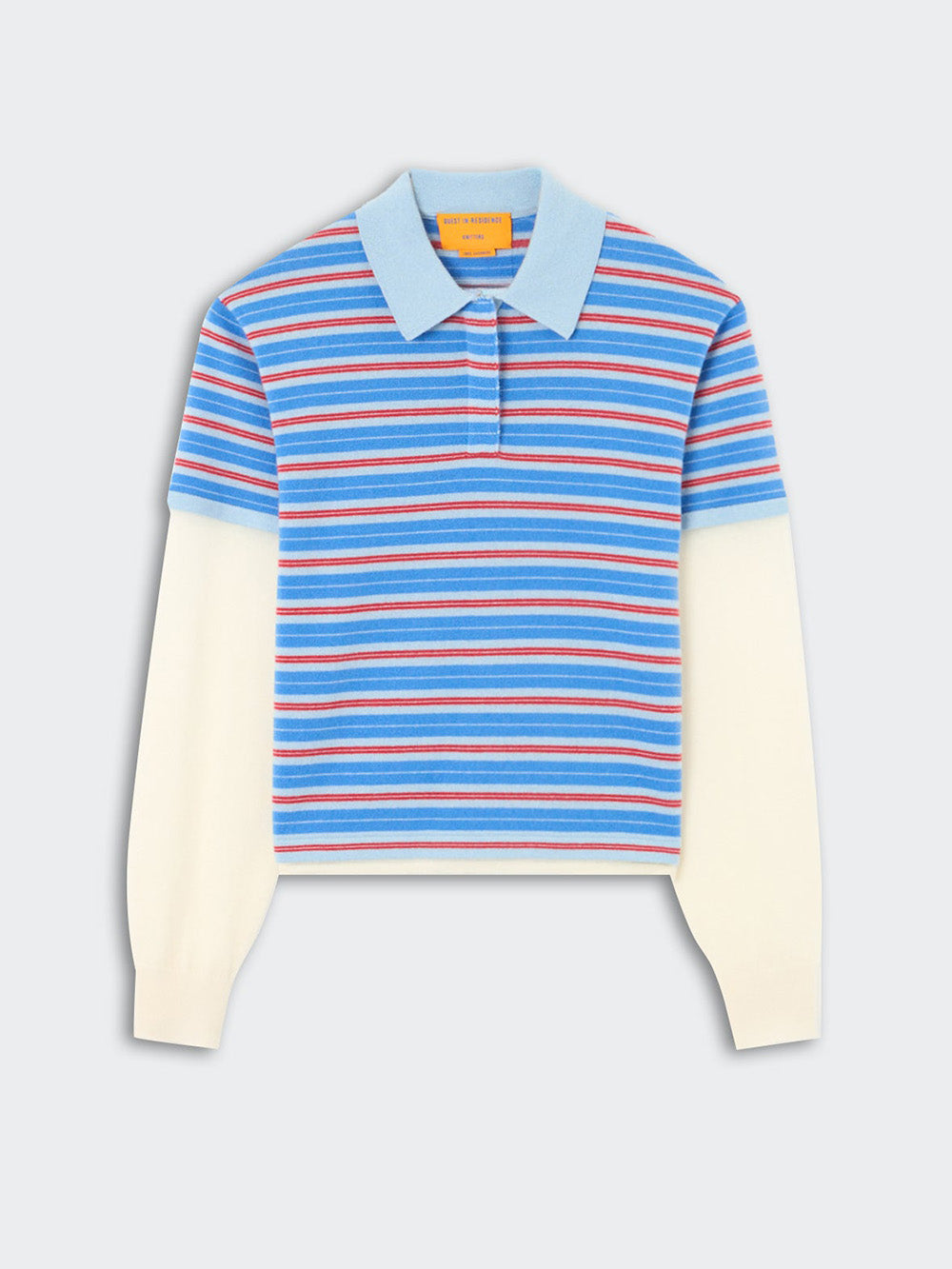 Guest in Residence's Trompe l'Oeil Rugby Sweater is crafted from cashmere, featuring a blue and red striped T-shirt section and a longer, cream-colored section. This trompe l'oeil top creates a layered effect.